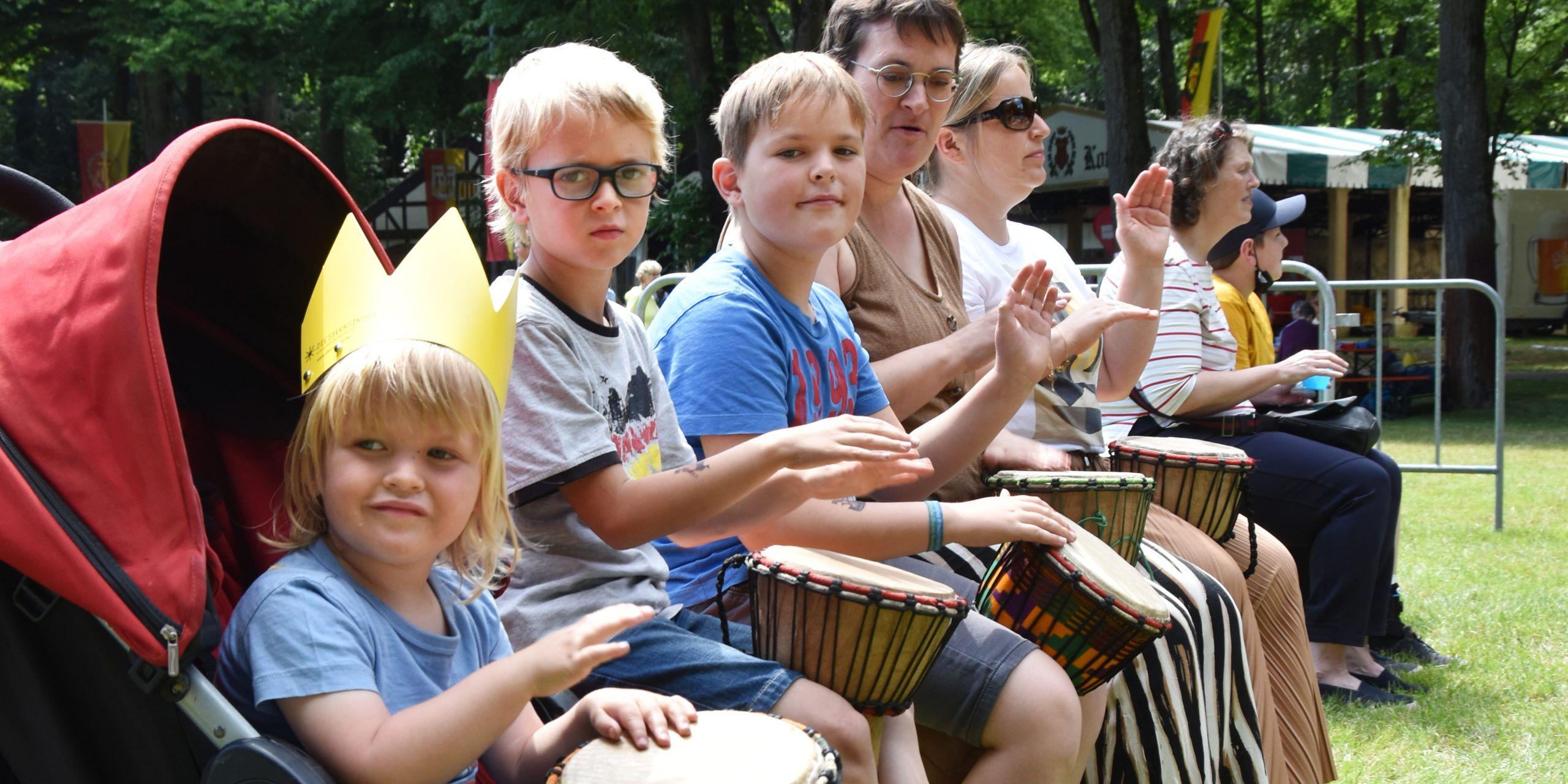 Nach dem Gottesdienst startete das bunte Programm. Bis 14.00 Uhr sorgte die Band „Randale“ für Stimmung. Danach jonglierte der Gaukler Alf auf der Bühne mit brennenden Fackeln. Anschließend übernahm Johnny Lamprecht. An die 100 Trommeln verteilte er an die Gäste. Anschließend durften alle nach Anleitung lautstark trommeln. „Masimba, Masamba, sitookootoo …“ war der Text eines Liedes. Dabei sollten die Kinder trommeln und alle Erwachsenen sollten im Takt dazu tanzen: „Zwei links, zwei rechts …“