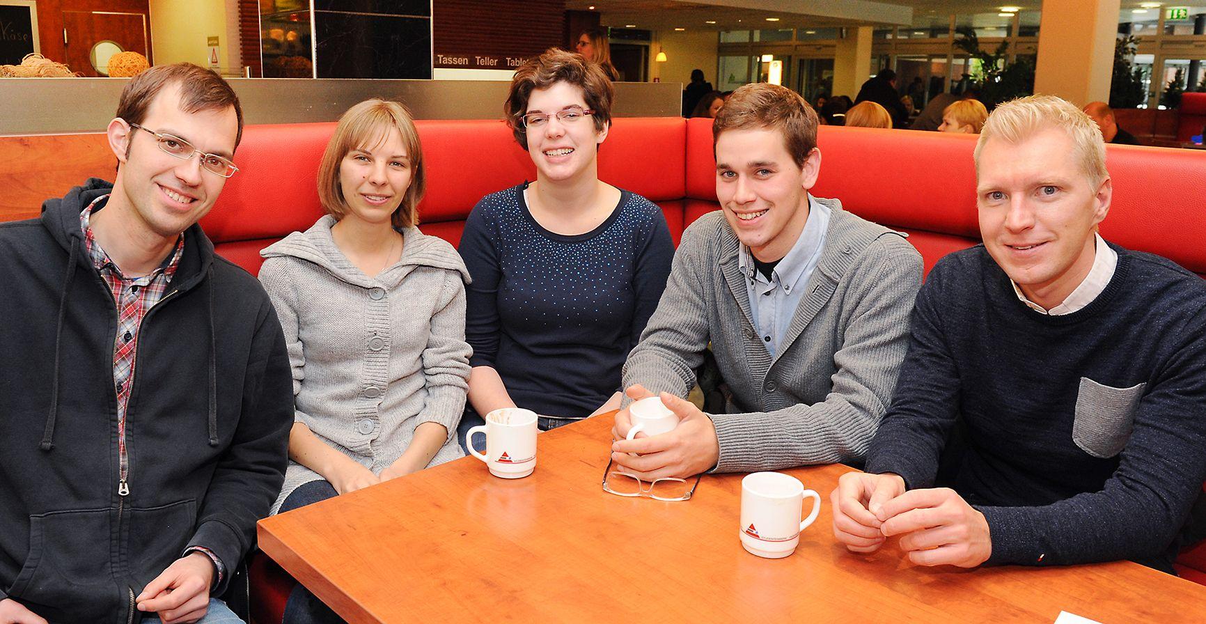 Gespräch in der Caféteria der Uni: Gemeindeassistent Eric Bernhard, Wioletta Czichon, Katharina Röth, Johannes Frenz und Studentenpfarrer Nils Petrat (v. l.). (Foto: Wiedenhaus)