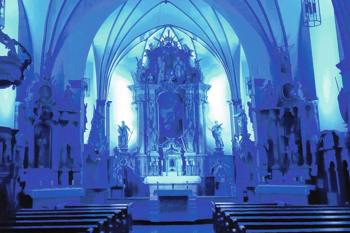 Die computergesteuerte Licht- und Tonanlage in der katholischen Pfarrkirche St. Clemens ermöglicht es, das Gotteshaus in verschiedenfarbiges Licht zu tauchen. Pilger und Besucher können darüber hinaus diverse Andachten abrufen. Kleines Foto: Gelebte Ökumene in Kallenhardt: Das Pilger-Projekt wird nicht nur von der katholischen und evangelischen Kirche getragen, viele weitere Förderer und Unterstützer sind „mit im Boot“.Fotos: Wiedenhaus