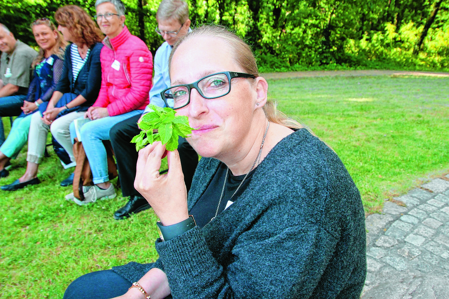 In der Gruppe einer Bio-Gärtnerin schnuppert Tanja Kirchner an frischer Minze. Foto: Fortmeier