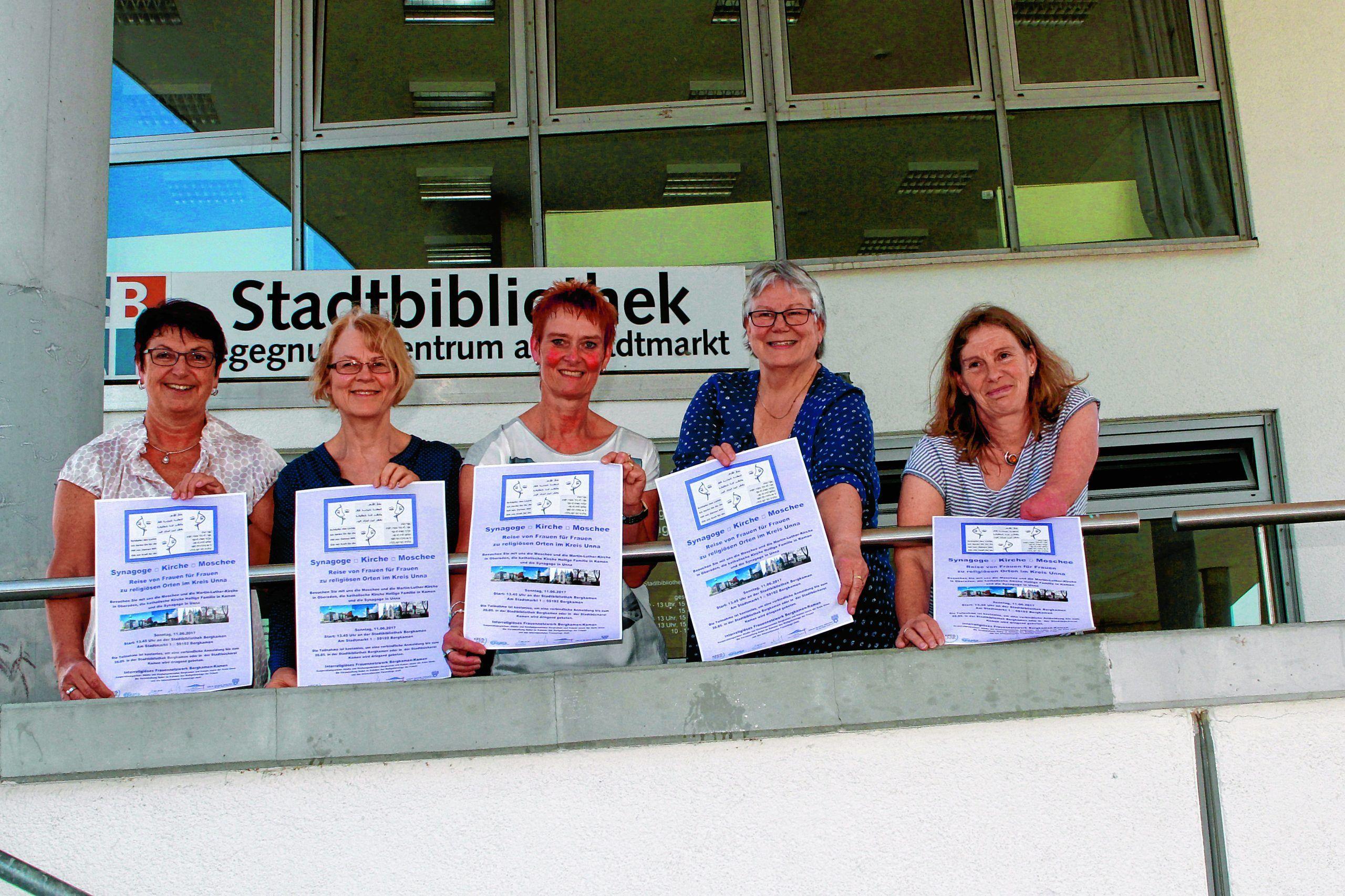 Sechs Frauen erzählten im Couchgespräch mit Moderatorin Luise Lunemann im März 2017 in der Stadtbibliothek Bergkamen von ihren Glaubenserfahrungen – davon, aus der Taufberufung heraus als Christin zu leben, wie es ist, Jüdin zu sein, oder als Muslima dem Koran zu folgen. Jetzt geht es mit dem Bus zu den „Glaubensräumen“ der drei Buchreligionen im Kreis Unna. Die Teilnehmerinnen an der vom Interreligiösen Frauennetzwerk Bergkamen-­Kamen initiierten Rundfahrt besuchen die Moschee und die evangelische Martin-­Luther-Kirche in Oberaden, erfahren Details über das Projekt „Kirche im Zelt“ in der katholischen Kirche „Heilige Familie“ in Kamen und lernen die Sy­nagoge in Unna kennen.