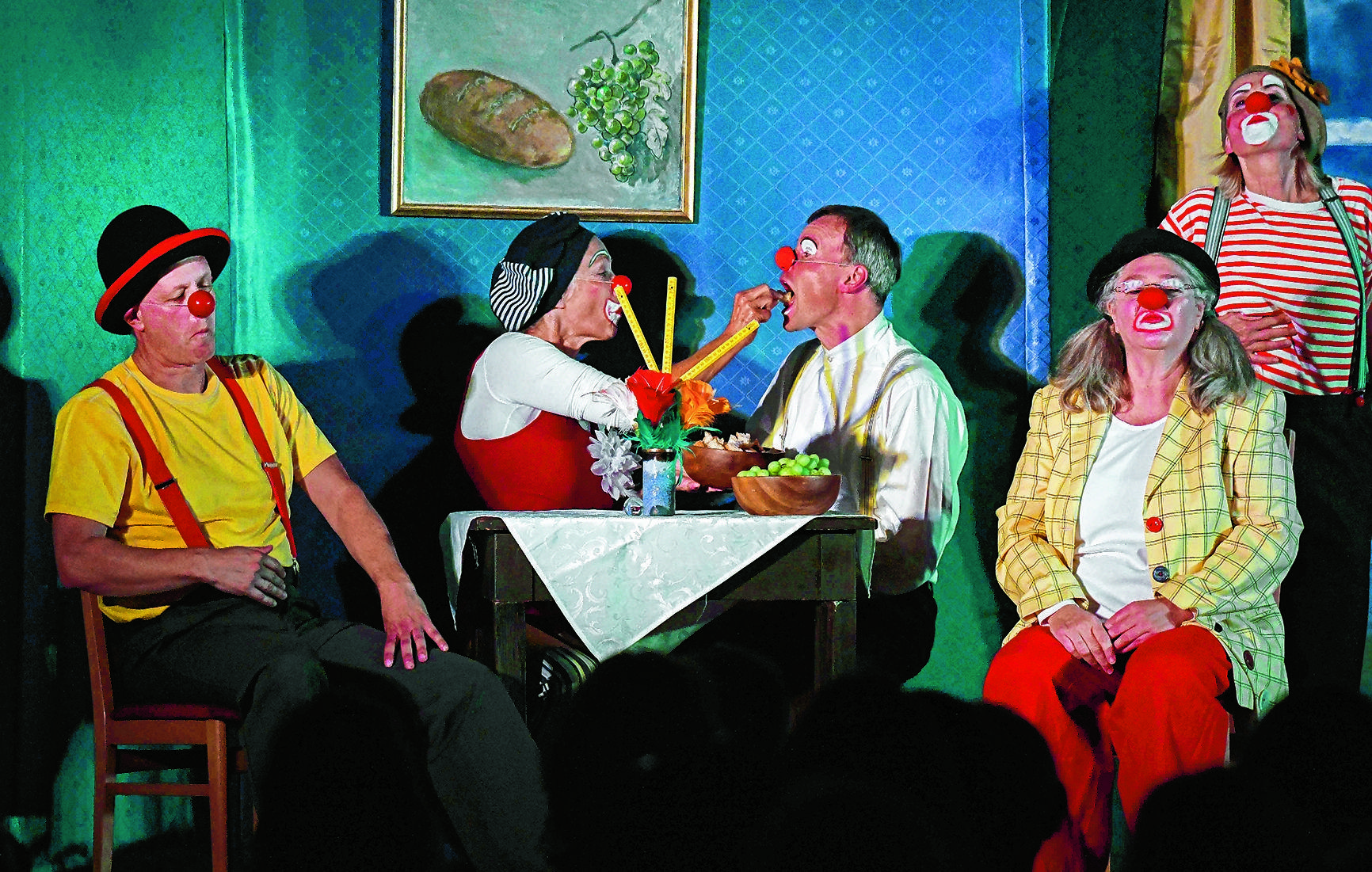 Lachende, aber auch nachdenkliche Gesichter im Publikum, viel Applaus für die fünf Kirchenclowns auf der Bühne: Ihre ganz eigene Interpretation des biblischen Gleichnisses vom Festmahl (Lk 14,15 ff.) ohne Worte, aber mit Musik begeisterte die Zuschauer bei der Tournee der Clowns durch das Südsauerland.