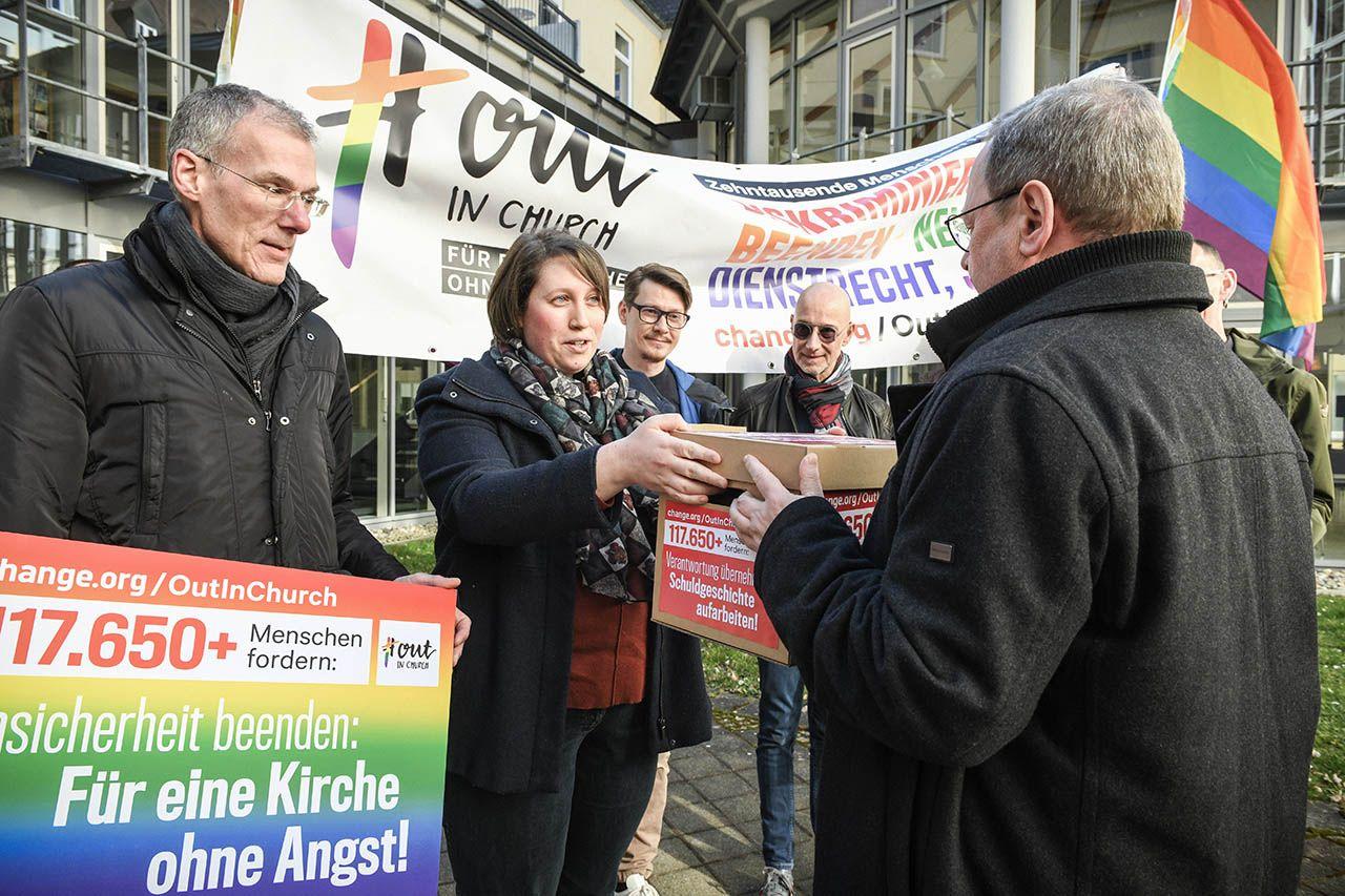 Bischof Georg Bätzing (r.), Vorsitzender der Deutschen Bischofskonferenz (DBK), nimmt einen Karton der Initiative #outinchurch entgegen mit einigen der über 110.000 Unterschriften.