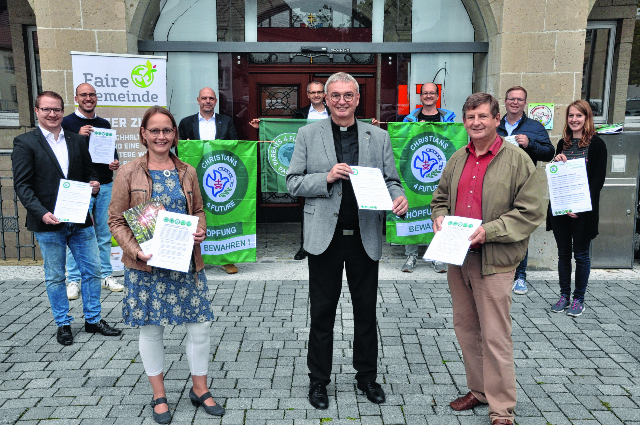 Übergabe der Forderungen (vordere Reihe, von links): Dr.Annegret Meyer, Prälat Thomas Dornseifer, Dr.Franz-Josef Klausdeinken; (hintere Reihe, von links): Michael Peine, Maximilian Schultes, Stefan Wisbereit („Paderborn For Future“), Michael Schurwanz, Marcus Zauner („Parents For Future“), Jan Hilkenbach und Helena Schmidt. (Foto: Claudia Auffenberg)