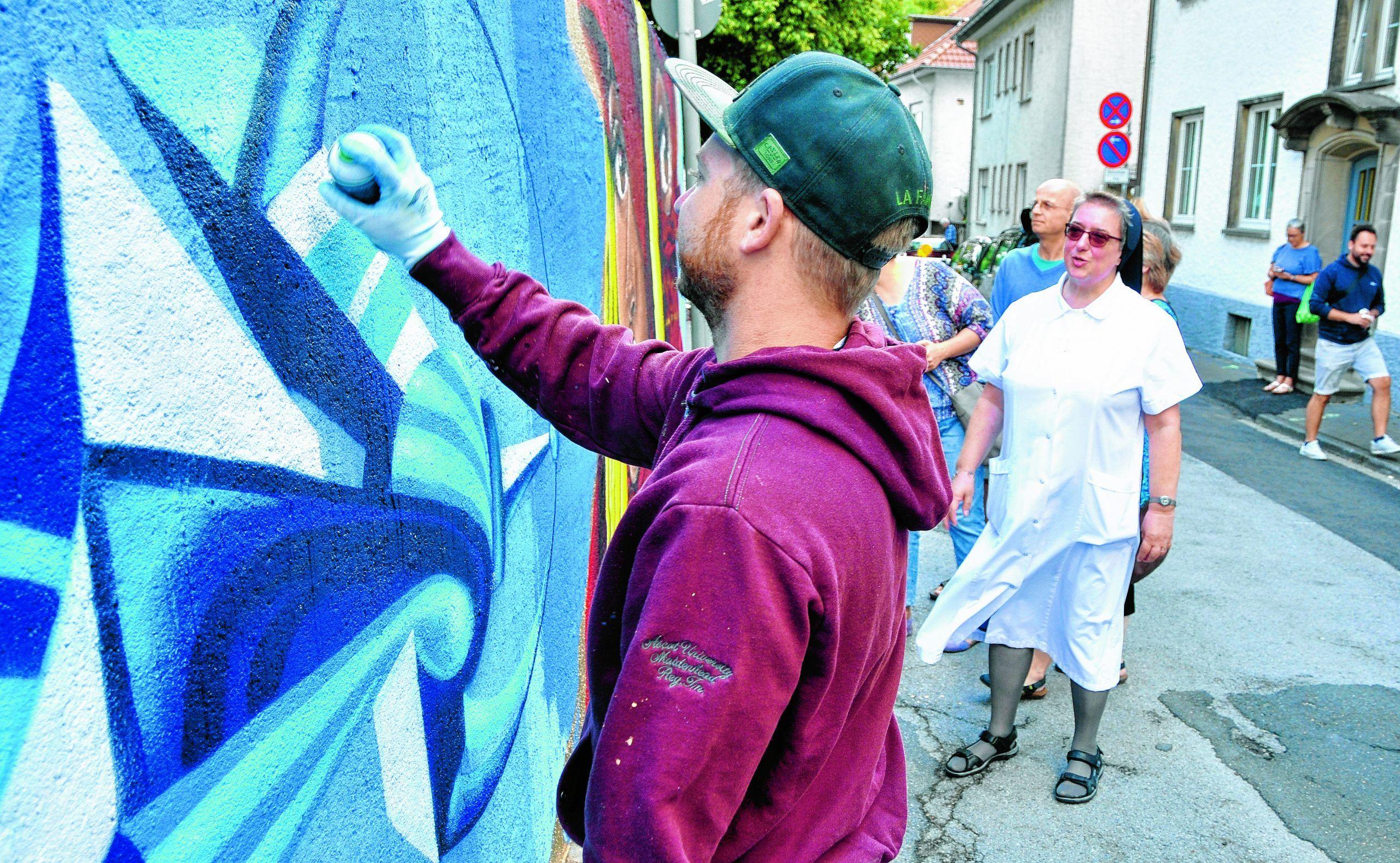 So kam es, dass am zweiten Samstag im August 24 junge Künstler überall an dem langen Mauerstück sprayten und malten, darunter Prominente wie der Maler Herman Reichold. Einzige Vorgabe der Schwestern: Die Arbeiten sollten sich mit den „Sieben Werken der Barmherzigkeit“ auseinandersetzen. „Sehr bunt“ und aussagekräftig seien die Wandbilder, freute sich Schwester Katharina M. Mock.