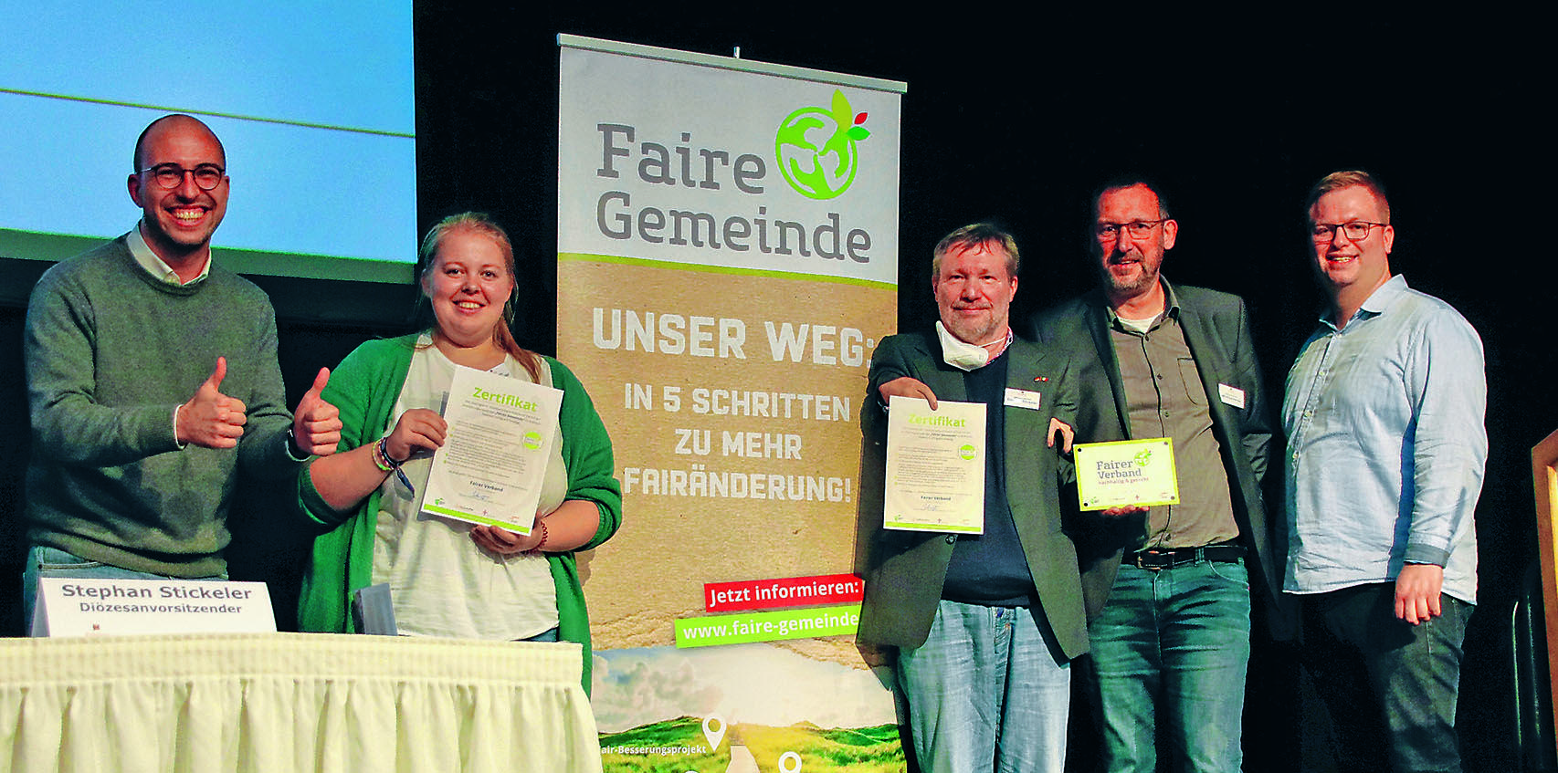 Für sein Engagement zum Thema Nachhaltigkeit wurde das Kolpingwerk als Fairer Verband ausgezeichnet. Maximilian Schultes und Jan Hilkenbach nahmen die Auszeichnung vor. Vom über 25 Jahre andauernden Einsatz für Fairen Handel mit dem TATICO-Kaffee über Bildungsangebote zum Thema Nachhaltigkeit bis zur Aktion Kolping-Radeln im Sommer, bei dem mehr als 105000 Kilometer zusammenkamen, reiche die Palette.