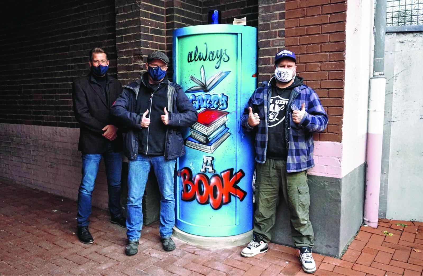 Polizist Dirk Schade, Caritas-Mitarbeiter Uwe Eggert und Graffitti-Künstler Kai Wohlgemuth (von links) vor dem Bücherschrank. Foto: Körtling