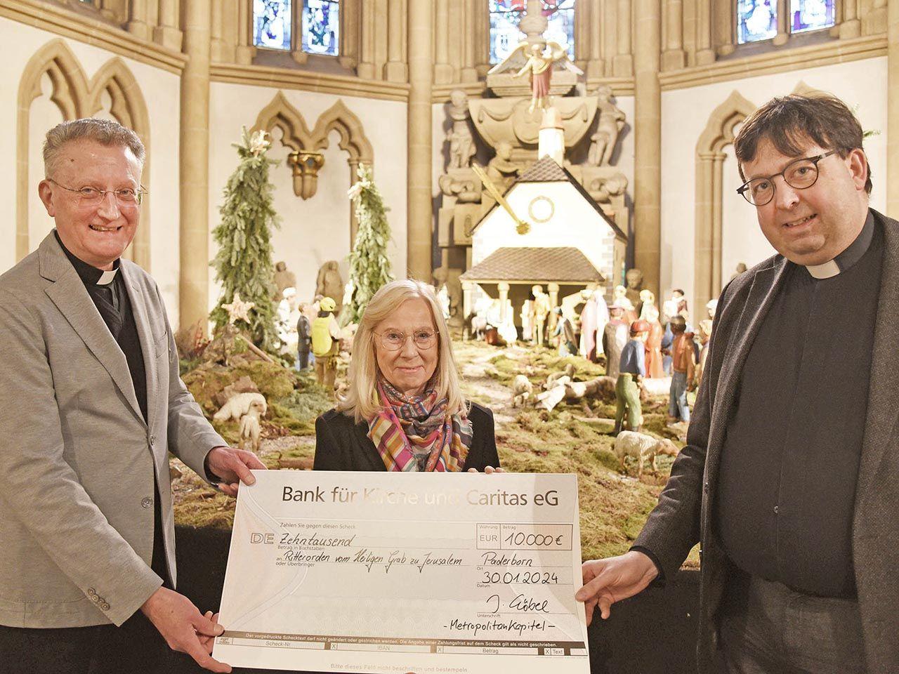 Mit der Summe der Krippenaktion kann Kindern trotz des Konfliktes im Heiligen Land der Schulbesuch ermöglicht werden, der auch zur religiösen Toleranz beiträgt. Die Spenden fließen in die Arbeit der Komturei St. Meinwerk des Ritterordens vom Heiligen Grab zu Jerusalem. Dompropst Monsignore Joachim Göbel übergab mit Dompastor Matthias Klauke den Spendenscheck an Dr. Juliane Ohm von der Komturei St. Meinwerk Paderborn des Ritterordens.