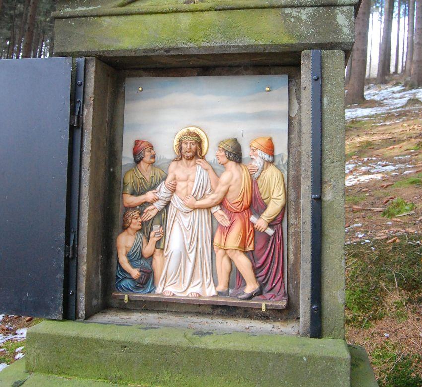 Vor dem Stationsgehäuse ist in den Boden eine Sandsteinplatte eingelassen, auf der in früheren Zeiten so mancher Gläubige gekniet hat, um innig im Gebet den Leidensweg Christi nachzuvollziehen.