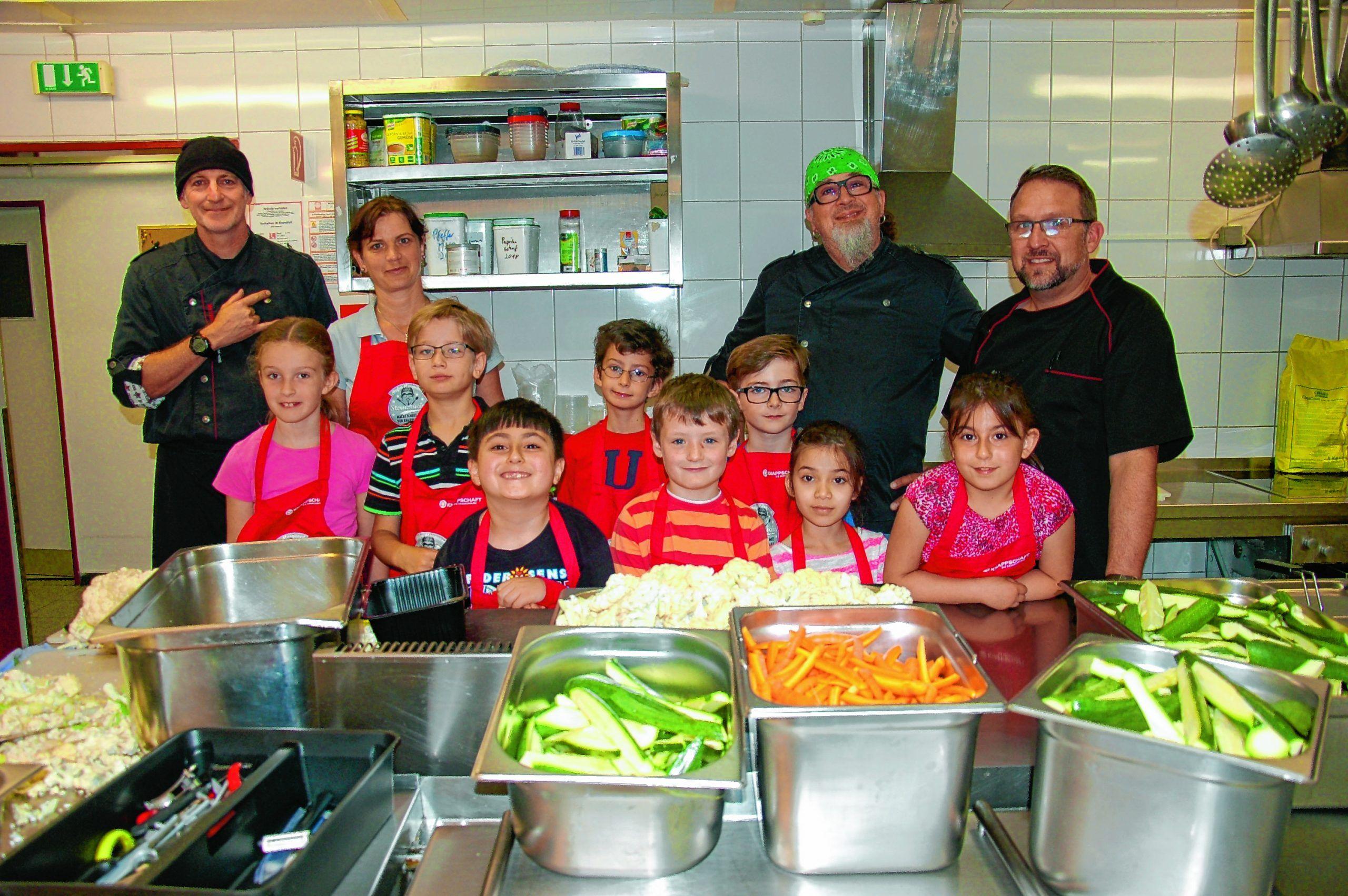 In der „Caritas-Kochwerkstatt“ ist Marc Schütte der Hausherr und sorgt täglich für bis zu 230 Gerichte. Doch er gab gerne den Löffel aus der Hand, als Stefan Marquard kam, um mit den Kinder der Offenen Ganztagsgrundschule (OGGS) Georg zu kochen. In der letzten Woche vor den Sommerferien machte der Fernsehkoch mit seinem Projekt „Sterneküche macht Schule“ dort Halt, und kochte gemeinsam mit den OGGS-­Kindern ein leckeres und gesundes Mittagessen.