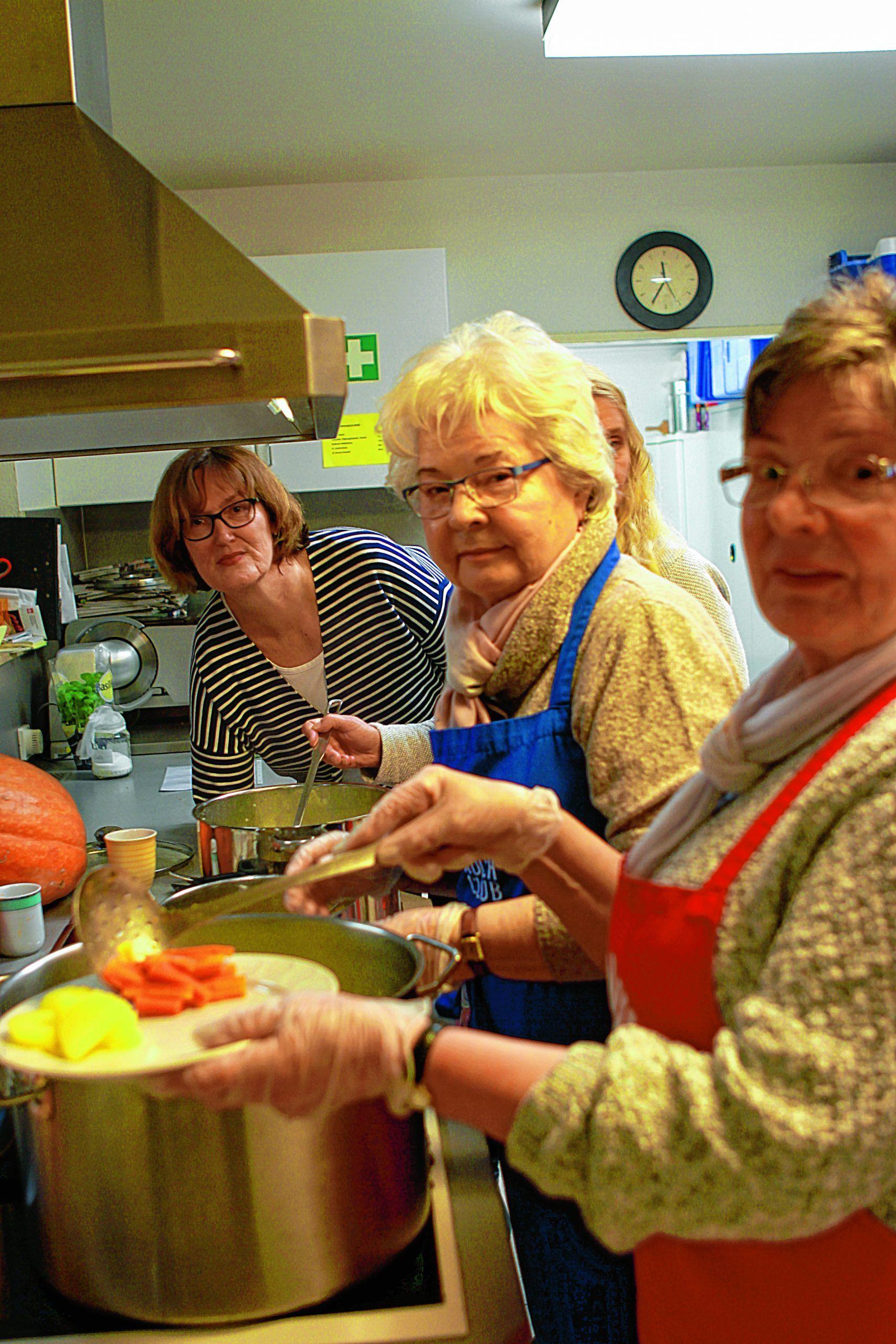 Die Menschen sitzen an den Tischen in kleinen Gruppen beisammen, reden, diskutieren, tauschen sich aus. So mancher kommt regelmäßig, einige sogar schon seit Jahren. In der Gemeinschaft schmecke es ihnen noch besser, so ihr Fazit. Die Pflege der sozialen Kontakte ist ein wichtiger Aspekt des Angebotes, das vom Patronatstag der heiligen Elisabeth am 19. November bis zum letzten Freitag vor der Karwoche läuft. Insgesamt 30 Ehrenamtliche organisieren derzeit im Wechsel die Suppenküche: Tag für Tag – auch am Sonntag und an Feiertagen. Montags und mittwochs greifen die ehrenamtlichen Mitarbeiterinnen und Mitarbeiter selbst zum Kochlöffel.