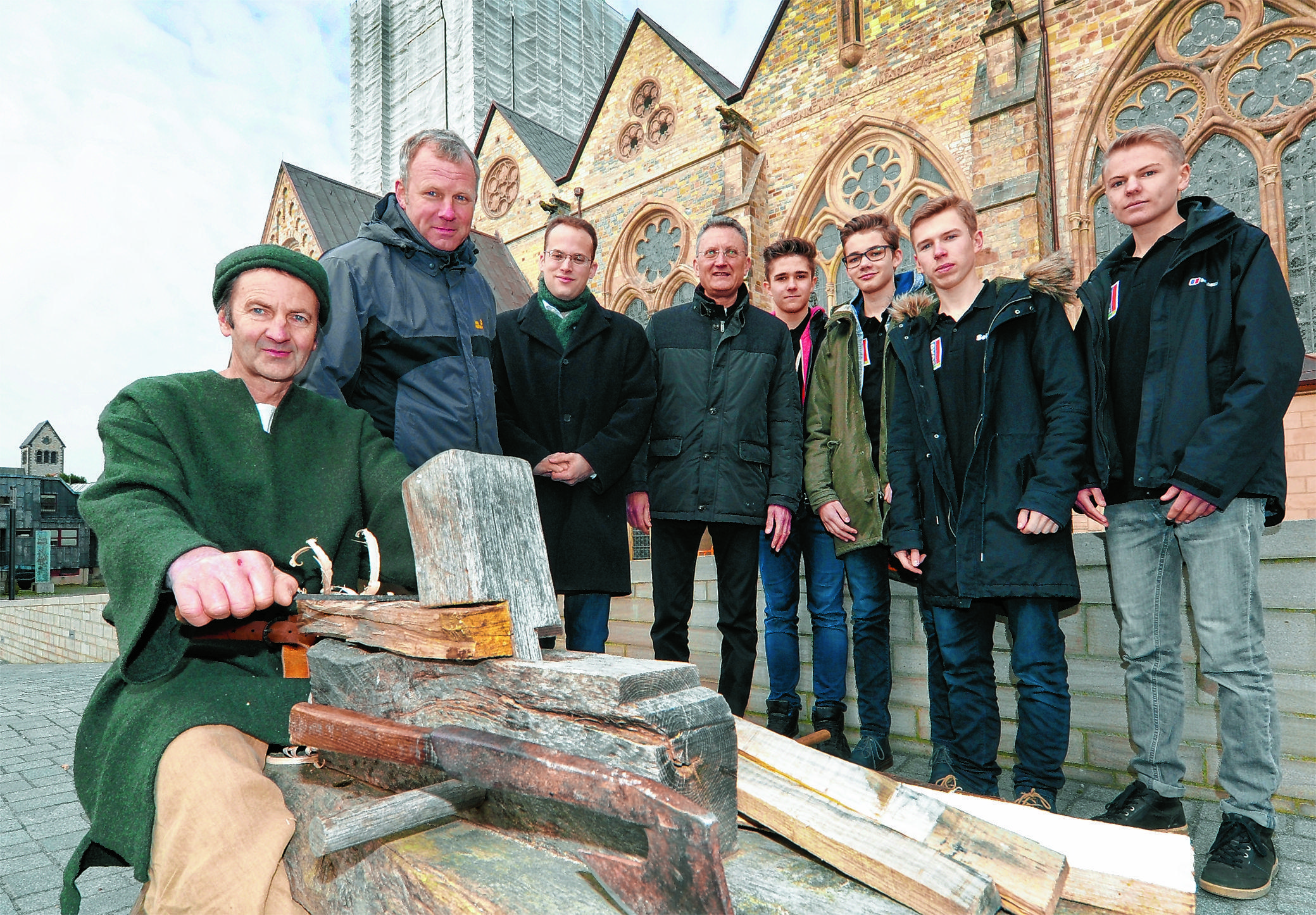 Anlässlich der Präsentation des Jubiläumsprogramms gibt Andreas Begemann einen Einblick in das Handwerk der Holzbearbeitung im Mittelalter. Der Zimmermeister gehört zum Team der „Lebendigen Dombauhütte“ im Kloster des Abdinghofgartens. Dort wird zwischen dem 23. Juni und dem 19. August gezeigt, wie der Imad-Dom entstand. Besucher können den Zimmerleuten, Steinmetzen und Schmieden dabei nicht nur über die Schulter schauen, sondern auch selbst zu Hammer, Säge und Meißel greifen.