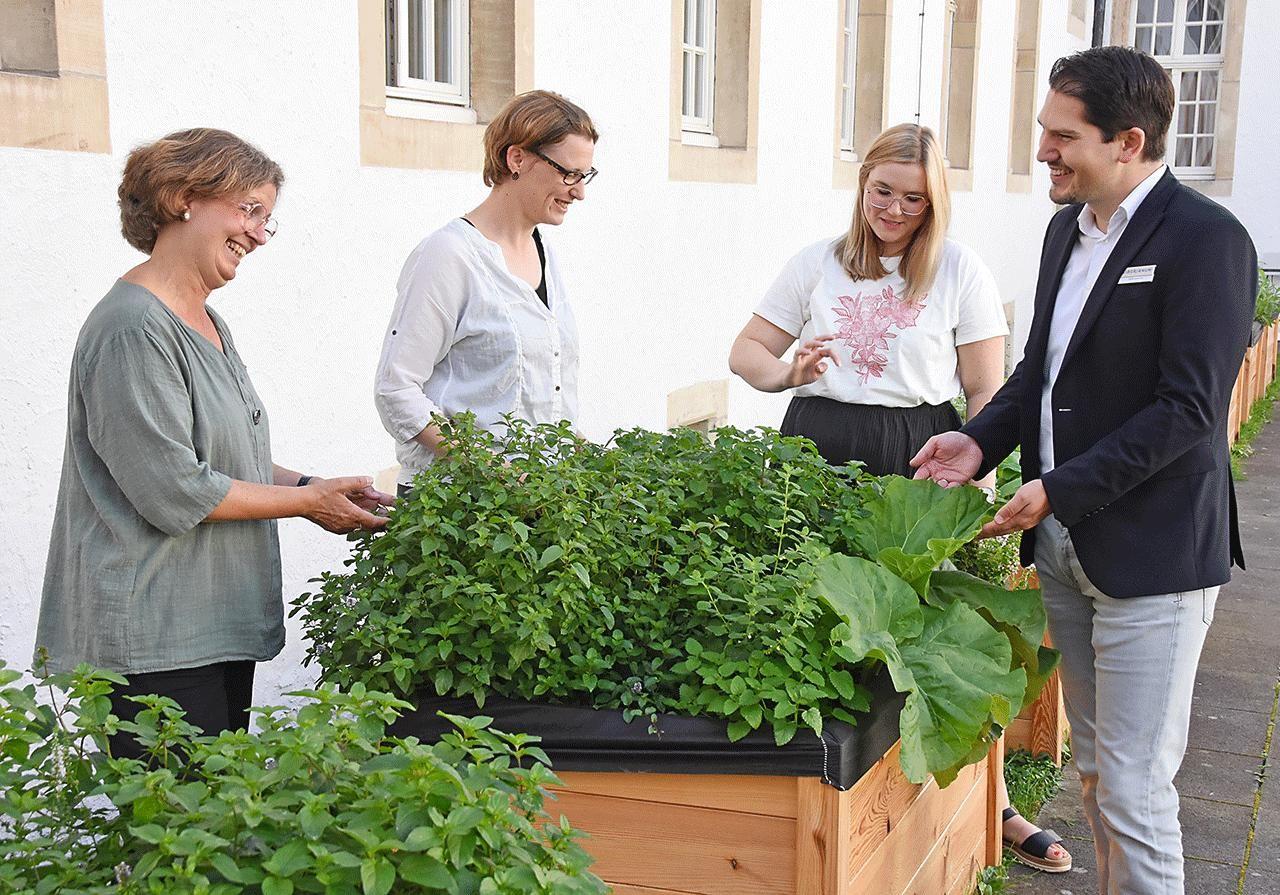 Das Organisationsteam der ersten Nachhaltigkeitsmesse LIBOFAIR: Dr. Heike Bee-Schroedter, Magdalena Wecker, Sarah Münsterteicher und Stefan Laskowski an den Kräuterbeeten im Klostergarten des Liborianums. (Foto: Auffenberg)