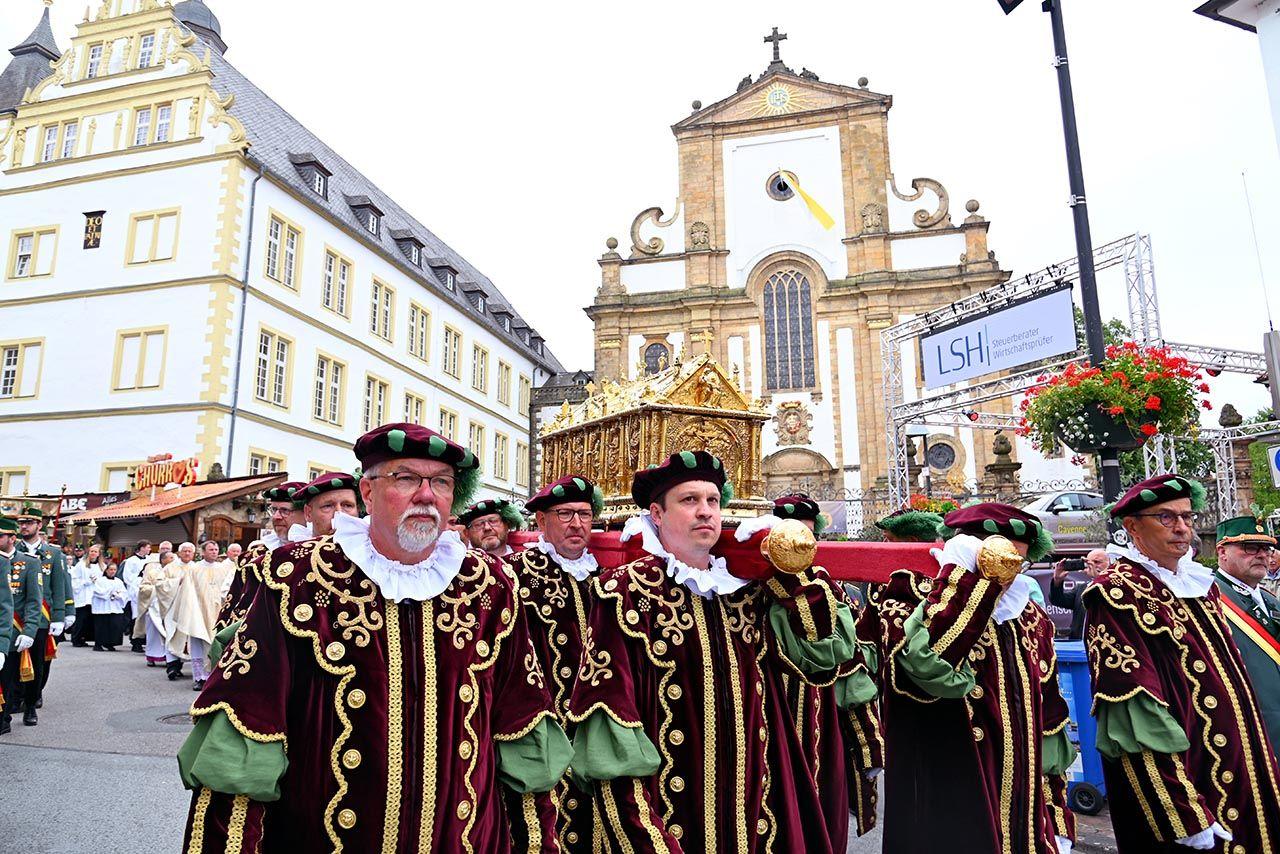 Kurz vor Beginn der Vesper hatte Domkapitular Thomas Dornseifer sie in seiner Eigenschaft als Präses der Libori-Schreinträgerschaft aus dem Altar geholt und in den goldenen Schrein gestellt. Rund 200 Kilogramm wiegt der, getragen wird er von acht Männern. Die Prozession zieht aus der Krypta durch den Dom, vorbei an den Schützen, die salutieren, und erklimmt schließlich die Treppe hinter dem Altar hoch zum Chor. Es ist dieser Moment, in dem viele die Luft anhalten, im Sinne von „Hoffentlich geht das gut!“. Aber es ist jedes Mal gut gegangen, auch in diesem Jahr, sie wuchten den Schrein auf den Libori-Festaltar, richten den Pfauenwedel dahinter auf, noch einmal erklingt der Tusch und wieder brandet Applaus im Dom auf.
