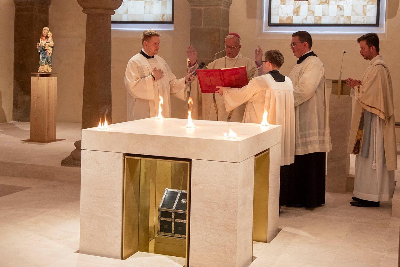 Für die umgestaltete Krypta hat der Oberpfälzer Bildhauer Helmut Langhammer den Altar als Ort der Eucharistiefeier und den Ambo als Ort der Verkündigung des Wortes Gottes neu geschaffen. Bevor das Wort Gottes in Lesungen aus dem Neuen Testament und Evangelium verkündet wurde, segnete Weihbischof Matthias König den neuen Ambo. Nach der Predigt des Weihbischofs begann der mehrstufige Ritus der Altarweihe mit der Anrufung der Heiligen. Es folgte der feierliche Moment, als die Libori-Reliquien unter dem Altar von Domkapitular Thomas Dornseifer und Dompropst Joachim Göbel beigesetzt wurden, wo sie in einem Ebenholzschrein jetzt von vier Seiten sichtbar ruhen und verehrt werden können. Nach Besprengung des Altars mit Weihwasser salbte der Weihbischof den Altar mit Chrisam und entzündete an fünf Stellen der Altarplatte Weihrauch. Die Gemeinde erbat anschließend die Herabkunft des Heiligen Geistes und Weihbischof König sang das Weihegebet. Zum Abschluss der Weihehandlung wurden die Altarkerzen entzündet.