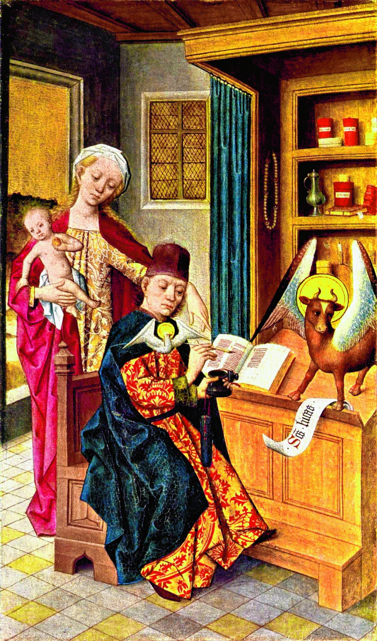 Der Evangelist Lukas mit seinen Symbolen, dem Stier und der Gottesmutter, die ihm hilft, das Evangelium richtig aufzuschreiben. Ein Bild von Hermen Rode aus dem Jahr 1484. Foto: Wikicommons