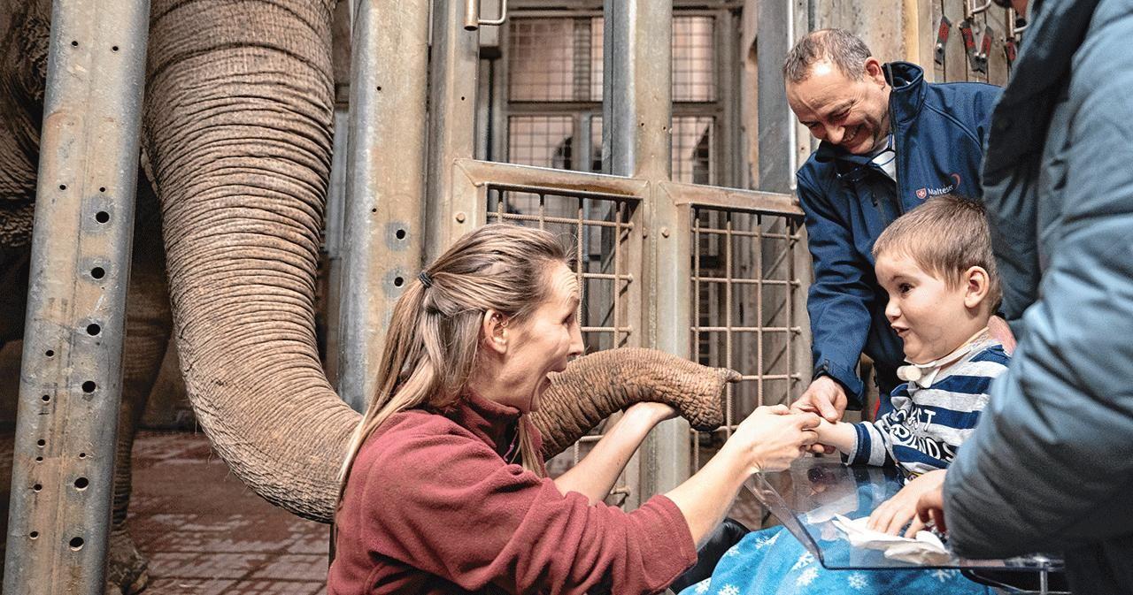 Der sechsjährige Leonid aus der Ukraine ist mit dem Herzenswunsch-Krankenwagen der Malteser in Südwestfalen zu seinem ersten Zoobesuch gefahren. Dabei durfte der schwer erkrankte Junge sogar die Elefantendame Tefi füttern.