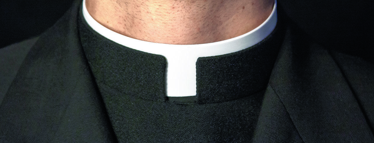 Close-up of Priest collar with black background.