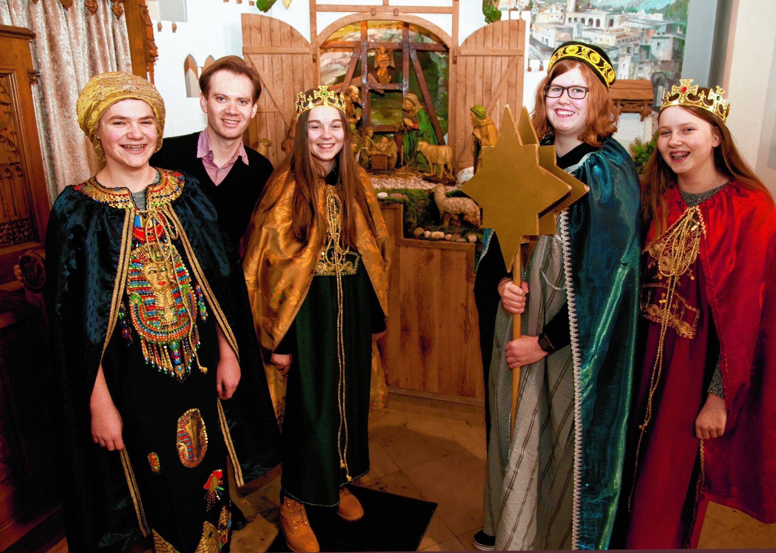 Neu eingekleidet: Nico Heinemann, Andre Hüsken, Nele Müller, Leonie Tegethoff und Nadine Brunnert vor der Krippe in der Pfarrkirche St. Martin. Einen neuen Stern erhalten sie bis zum Termin in Berlin auch noch.Foto: Karl-Martin Flüter