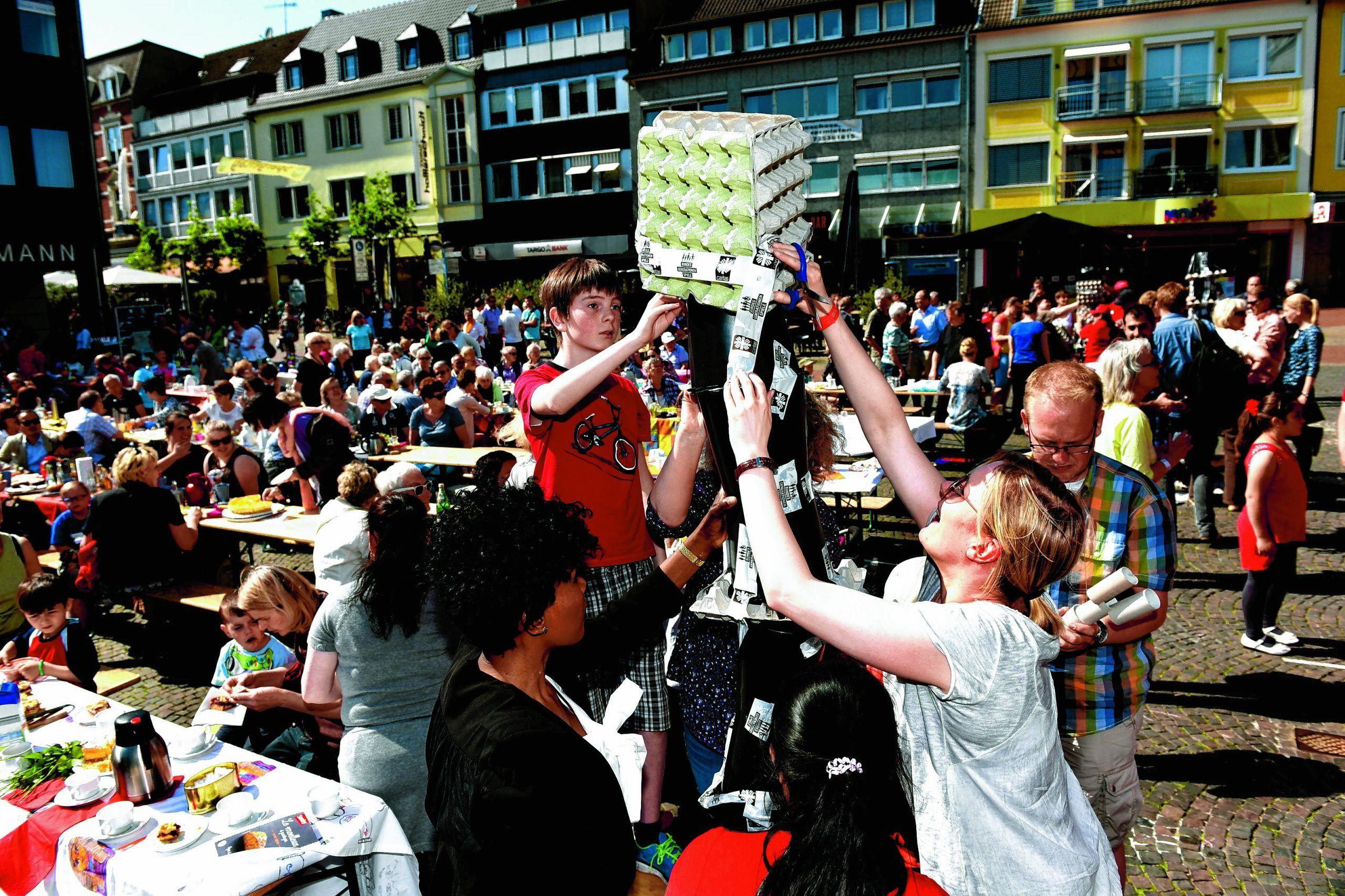 Schon die Kulisse zeigte, das an diesem Tag etwas ganz Besonderes stattfindet: Lange Tischreihen und eine große Bühne füllten den gesamten Marktplatz vor der Pauluskirche. Überall wurde gegessen, viele Leute teilten ihre Speisen mit den Nachbarn oder liefen gleich mit einem Tablett herum, um auch die Passanten anzusprechen und auf einen Imbiss einzuladen. Im Vorfeld konnten sich Familien, Vereine, Parteien, kirchliche Institutionen und Gruppen anmelden, um einen der Tische zu erhalten. Davon wurde reger Gebrauch gemacht, und alles kam einem guten Zweck zugute: Die Anmeldegebühren wurden der Caritas gespendet, die damit Projekte gegen Armut in Familien und gegen Einsamkeit im Alter unterstützt.