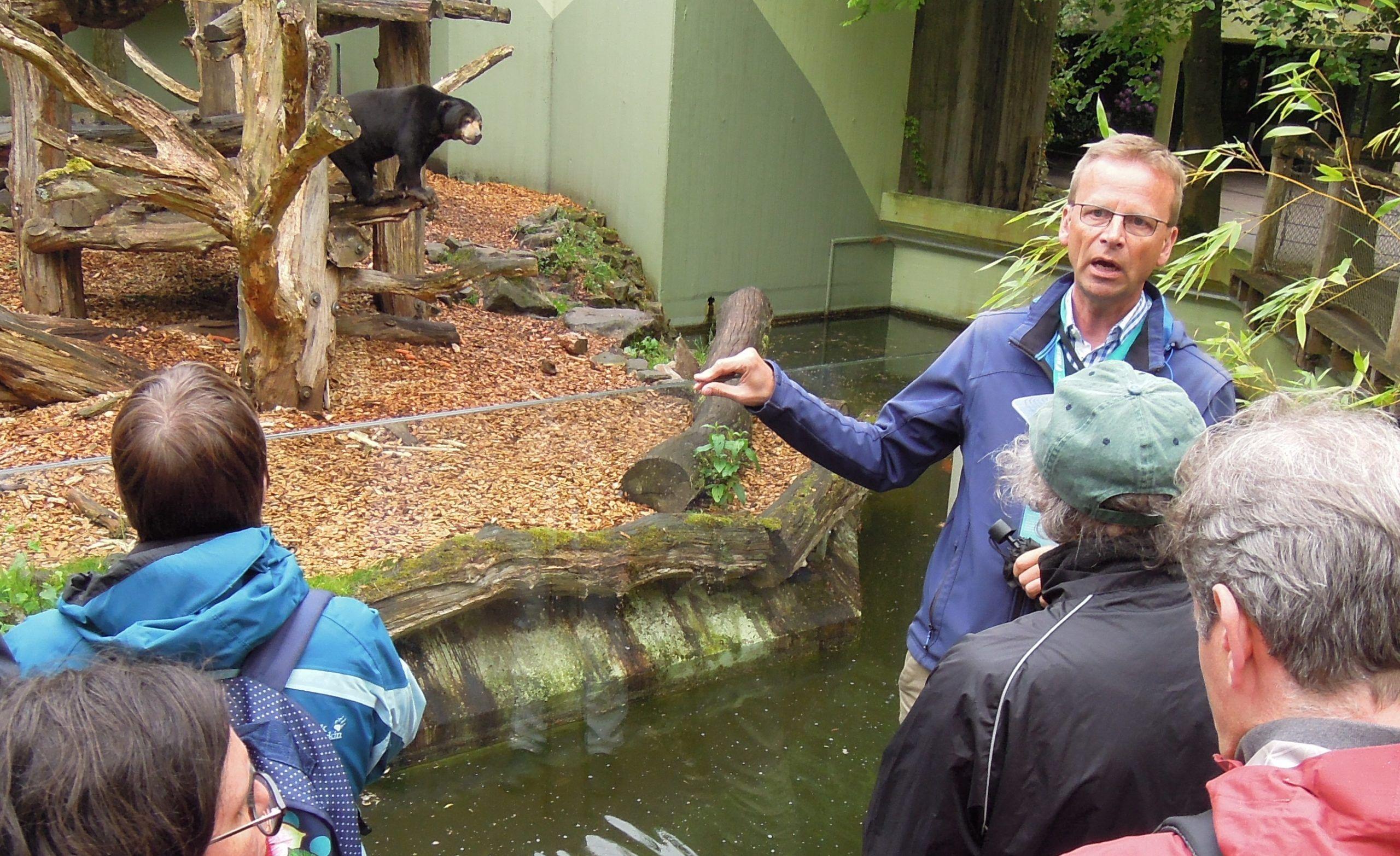 Zooführung mit Rainer Hagencord. Hinten links eine Malaienbärin, auch ihre Art ist extrem bedroht. Foto: Auffenberg