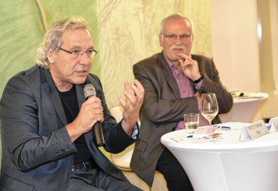 Leidenschaftlich vertrat Andreas Knie (links) seine Thesen im Gespräch mit DDr. Richard Geisen beim Querdenker-Abend. Foto: Körner