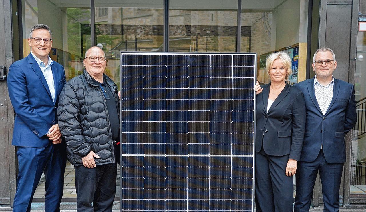 Stellten die aktuelle Sanierung des Katholischen Centrums vor, zu der auch der Bau einer großen Photovoltaikanlage gehört (v. l.): Thorsten Herrmann, Geschäftsführer beim Gemeindeverband Ruhr, Propst Andreas Coersmeier, Architektin Claudia Bolle (Bolle-Reißenweber Licker Architekten) und Projektleiter Oliver Löer (Gemeindeverband Ruhr). )Foto: Michael Bodin)