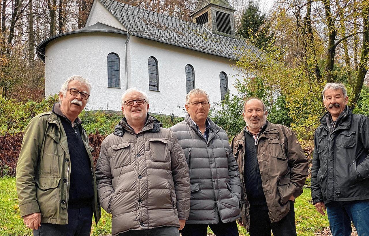 Viel Engagement zusammen mit handwerklichem Know-how zeigen die ehrenamtlichen Helfer. Sie renovieren die Hedwigskapelle an der Hermannstraße: Dr. Johannes Stefan Müller, Wilhelm Kleinemeier, Josef Wolfförster, Hans-Gerd Lappe und Bernd Müller. (Fotos: Horst Biere)