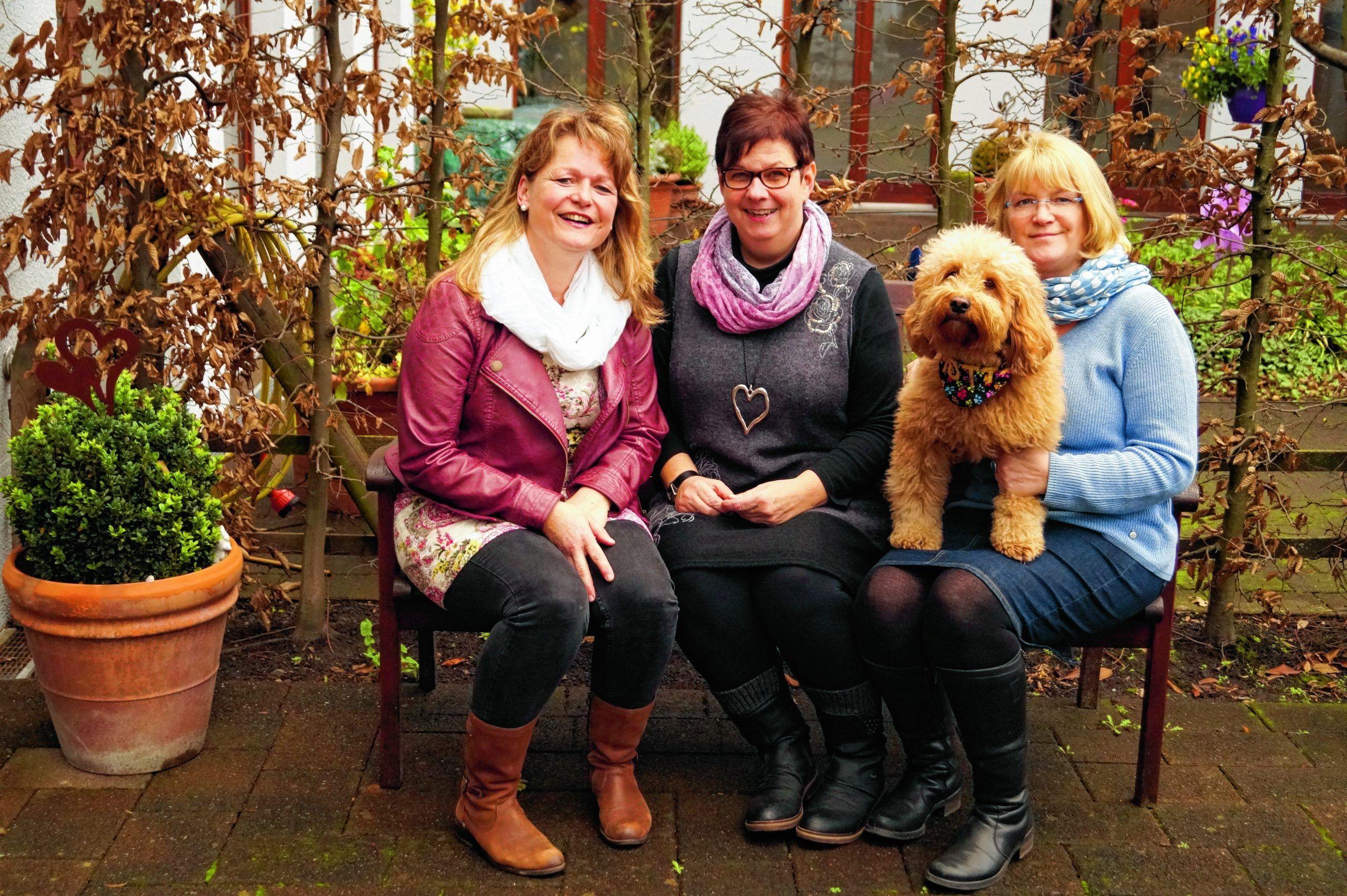 Trauerbegleitung mit vier Pfoten bieten (v. links): Gabriele Boriesosdiek, Ina Kasten-Kisling, Sylvia Blätgen und Hospiz-Hund „Motte“.