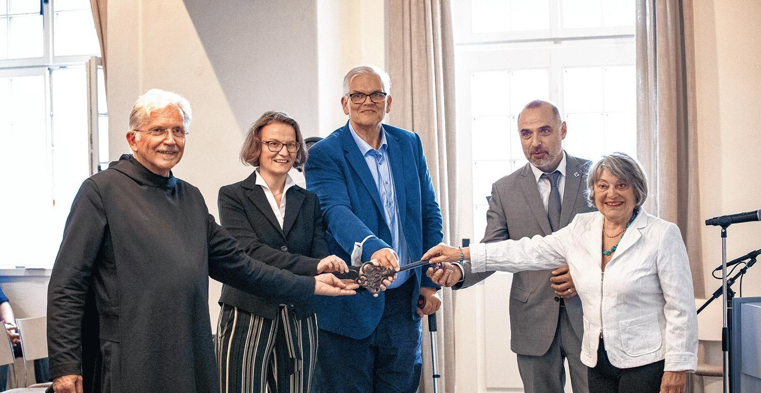Bei der symbolischen Schlüsselübergabe (v.l.): Pater Werner Vullhorst OSB, Ministerin Ina Scharrenbach, Regierungspräsident Hans-Josef Vogel, Bürgermeister Ralf Paul Bittner und Helgard Hennecke (Freundeskreis Historische Sakralbauten). Foto: (Christoph Söbbeler)