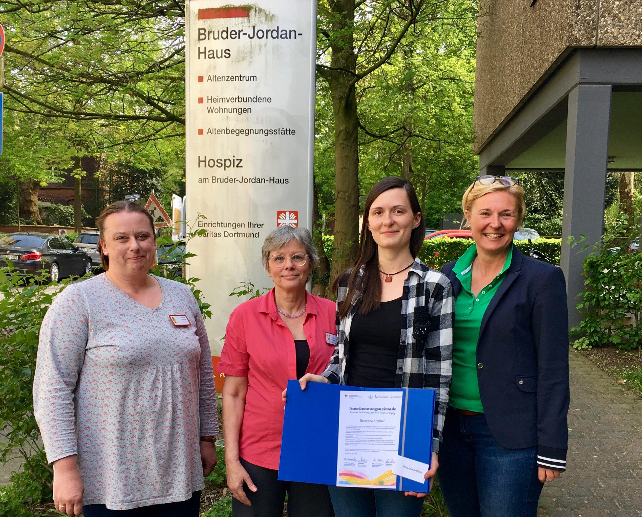 Freuen sich über die Auszeichnung: Simone Duvivier (Psychosoziale Begleitung), Steffi Czech (Koordinatorin Hospizdienst), Roswitha Kreßner und Kirsten Eichenauer (Leiterin Bruder-Jordan-Haus, von links).Foto: Caritas Dortmund