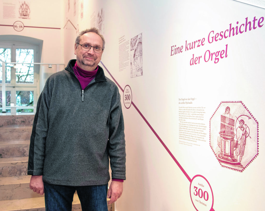 So ist es nicht überraschend, wie unterhaltsam die von ihm konzipierte Ausstellung ist. Überall pfeift, flötet und tutet es, man darf Register ziehen und Tasten drücken. Nach der Modernisierung in den vergangenen Monaten ist das alles noch anschaulicher geworden. Es fängt schon im Eingangsbereich an, und das nicht nur wegen des Tieftons Subcontra-C. Vom Erdgeschoss führt eine aufsteigende Zeitleiste im Treppenhaus Besucher durch die Orgelgeschichte, von der Antike bis in die Gegenwart.