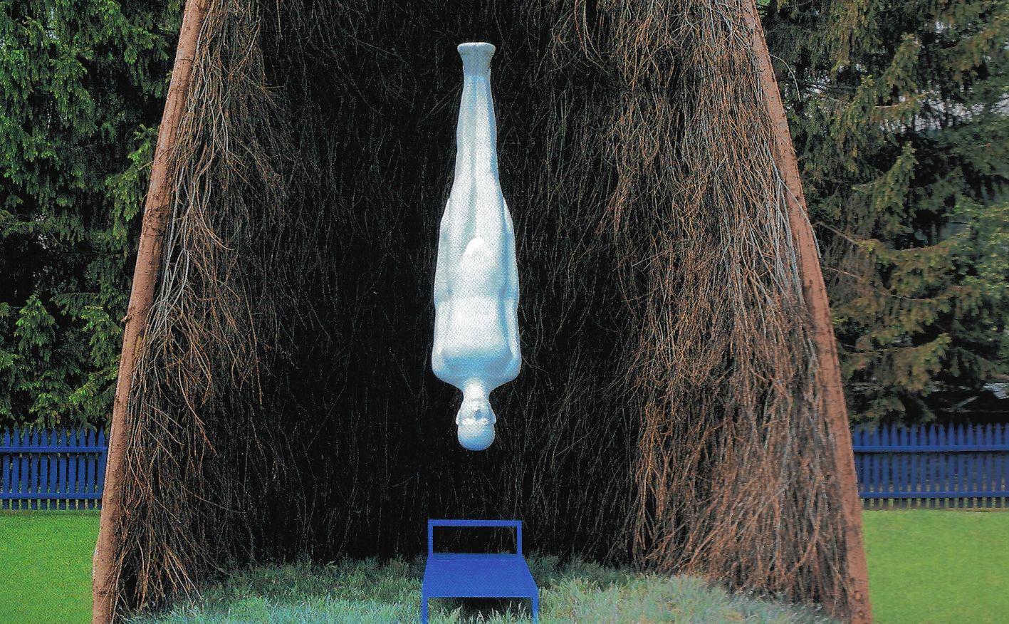 Ein merkwürdiges Bild einer Kreuzwegstation: Der amerikanische Künstler Robert Wilson hat sie geschaffen. Ein Reisigzelt, eine weiße Puppe eines nackten lebensgroßen Mannes hängt kopfüber von der Spitze herab und schwebt über einem blauen Bett. Es sieht fast aus wie ein Lot in Position. Darstellen möchte der Künstler die XIV. Station des traditionellen Kreuzweges: „Jesus wird in das Grab gelegt“.