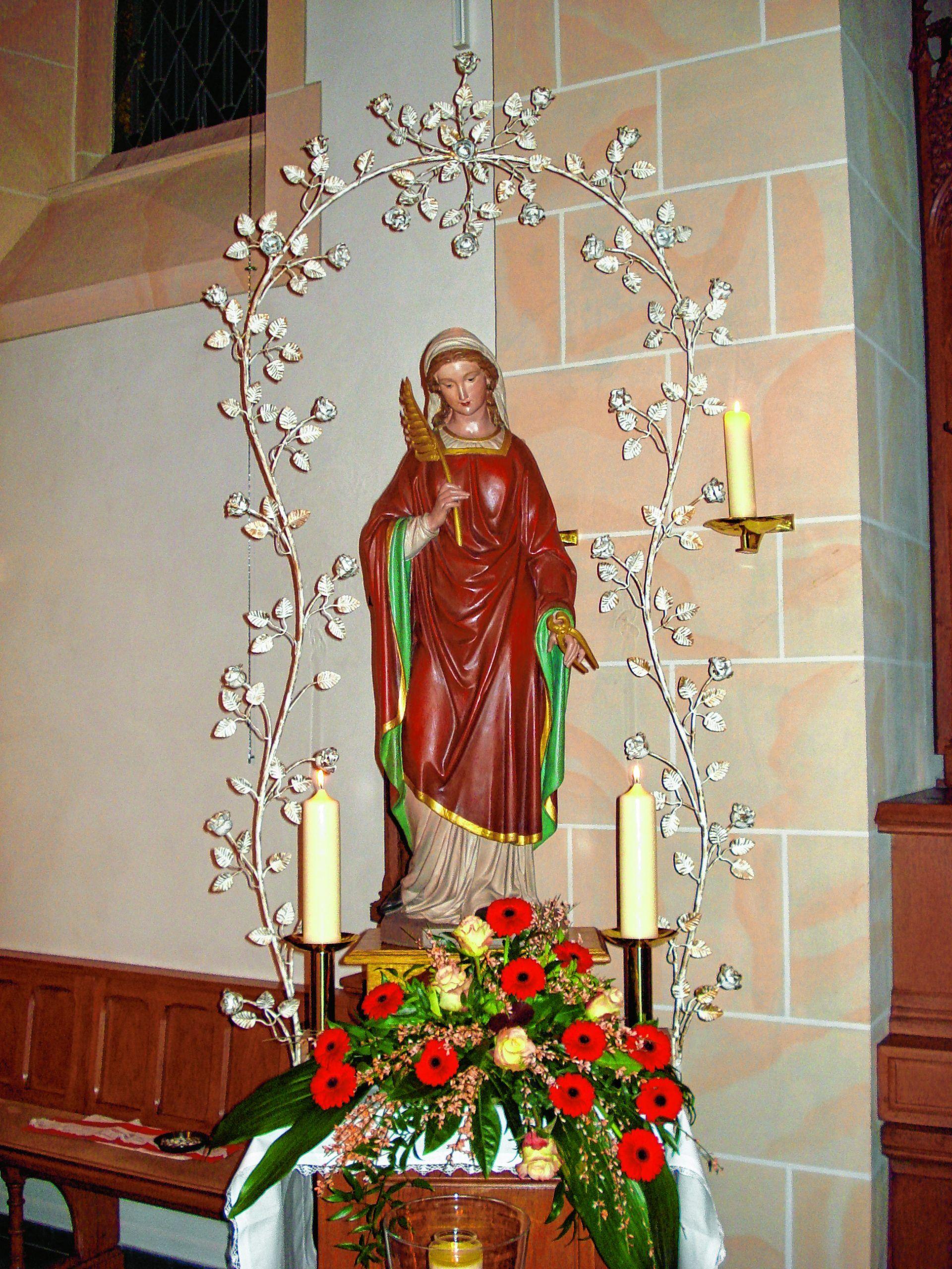 Die Attribute von heiligen Märtyrern sollen ja eigentlich auf deren Leiden hinweisen. Doch beim Anblick der Apollonia wird man auch an eigenes Martyrium erinnert und rutscht – zumindest in Gedanken – gleich ein wenig tiefer in den Behandlungsstuhl. Sie ist die Patronin der Zahnärzte und wird nun ausgerechnet mit einer Zange in der Hand dargestellt. Aua …