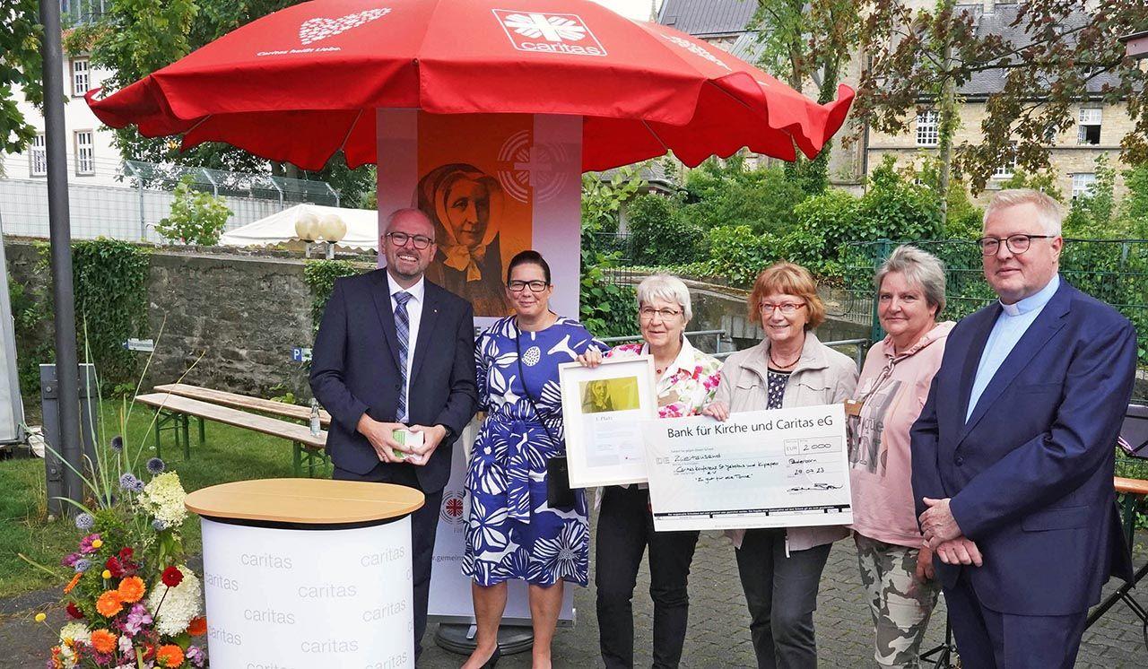 Den ersten Platz belegte ein Projekt der Caritas-Konferenz St. Jakobus in Winterberg (von links): die Diözesan-Caritasdirektoren Ralf Nolte und Esther van Bebber, Barbara Wirsing-Kremser, Monika Thielicke, Bettina Simon und Msgr. Michael Bredeck. (Foto: Markus Jonas)