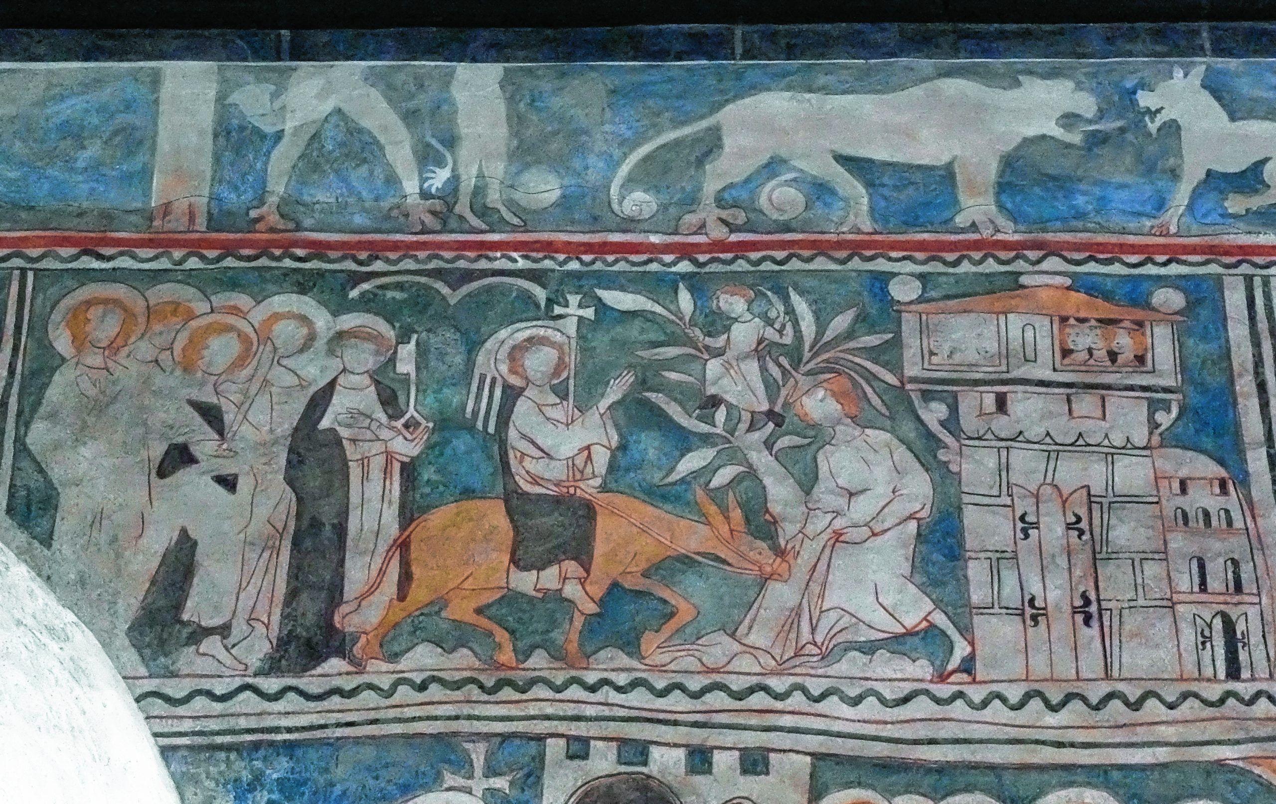 Jesus trifft auf Zachäus – gotische Wandmalerei in der Kapelle Sankt Niklausen ob Kerns in der Schweiz. Foto: KNA