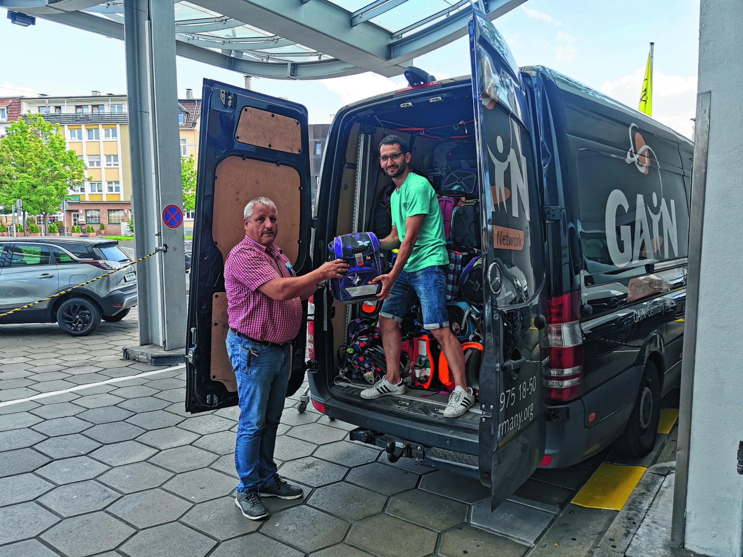 Haustechniker Detlef Dillmann (l.) übergab die von Bürgern beim Autohaus abgegebenen Tornister an einen GAiN-Mitarbeiter.