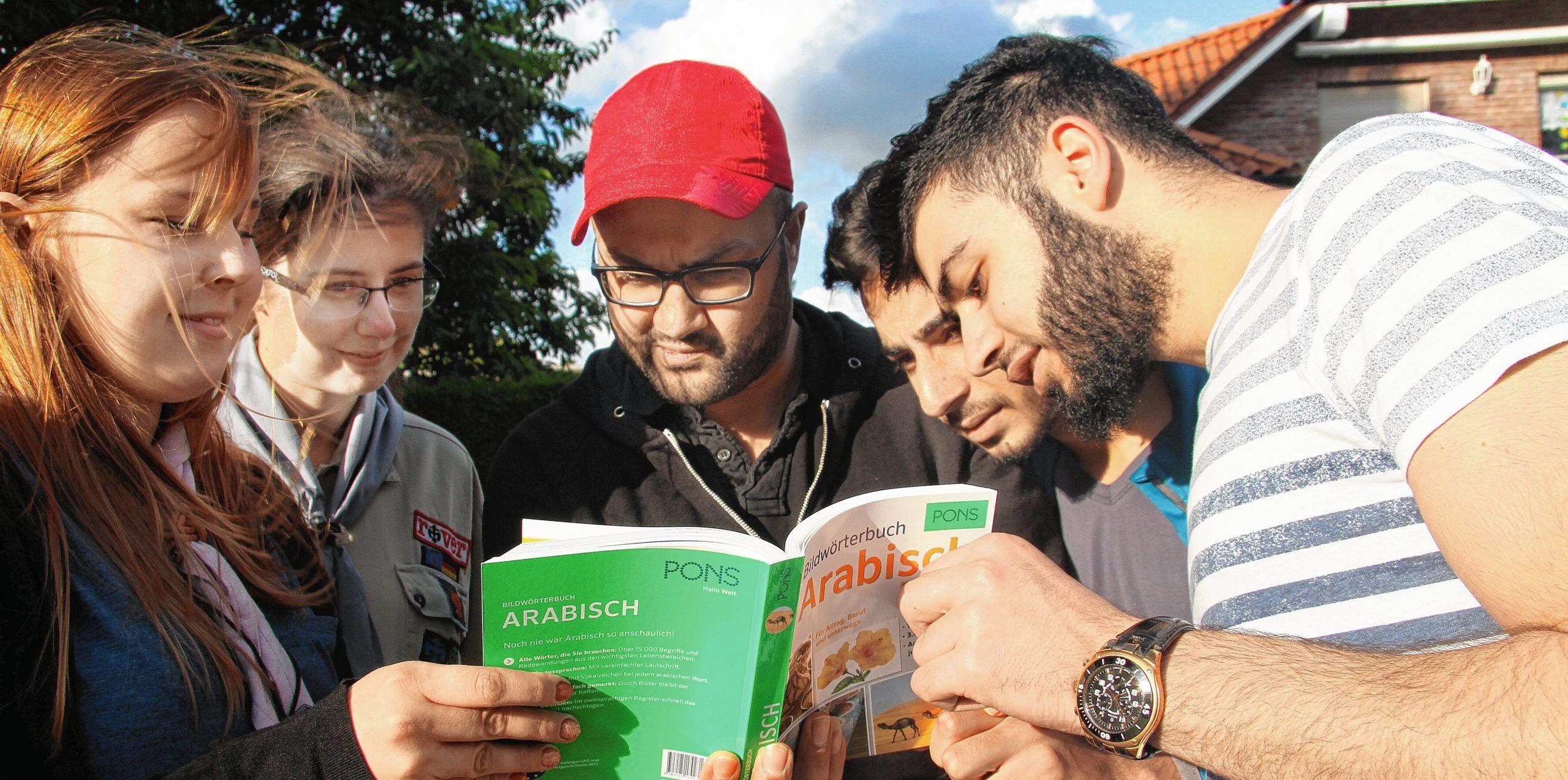 Derzeit sind drei Flüchtlinge im Alter zwischen 19 und 28 Jahren aus dem Libanon bei der DPSG Stamm Heilige Familie Lünen-Süd zu Gast. Da darf das Handbuch Arabisch/ Deutsch nicht fehlen. Foto: Plamper