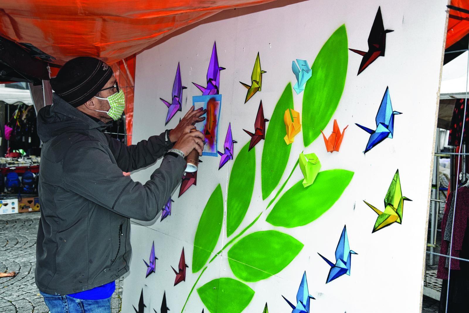 Auf dem Wochenmarkt in Berg kamen wurden gemeinsam Kraniche als Symbol des Friedens und der Freiheit gestaltet. Mit Menschenrechtstrainer Peter Steudtner, den sein Engagement für die Menschenrechte in der Türkei vor drei Jahren ins Gefängnis brachte, und dem Streetart- Künstler Mika Springwald, mit dem er seit zwei Jahren öffentlichkeitswirksame Aktionen durchführt, waren zwei interessante Gesprächspartner zum Thema des diesjährigen Monats der Weltmission zugegen. Schnell kamen die Marktbesucher ins Gespräch und verinnerlichten die Botschaft, selbst als kreative Friedensstifter öffentliche Räume zu gestalten. Mit einem großen vierteiligen Kunstwerk wurde ein Zeichen für den Frieden und den Zusammenhalt gesetzt. Bunte Kraniche und Friedensbotschaften zieren das Kunstwerk, das Mika Springwald zusammen mit den Marktbesuchern gestaltete.