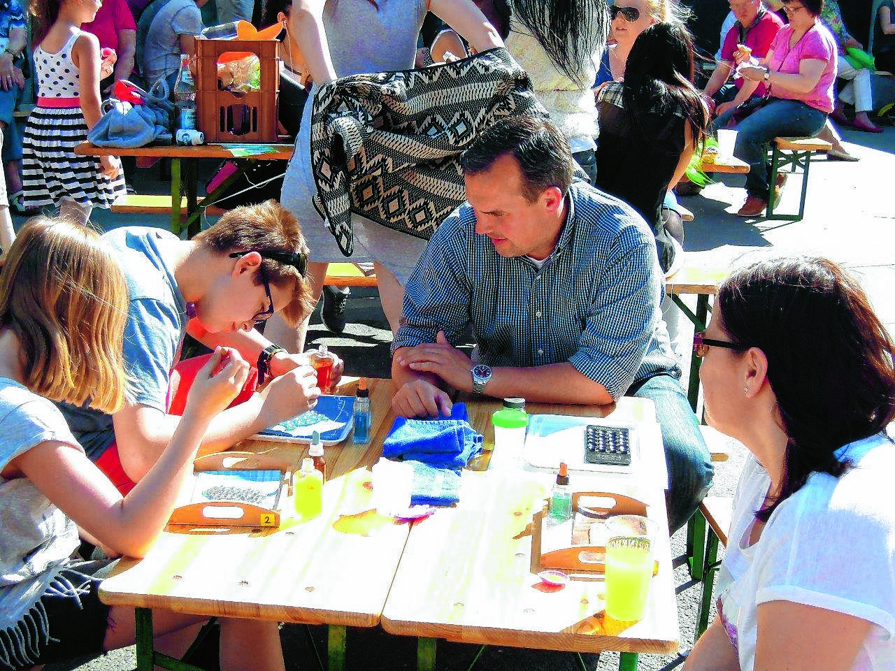 Am Familiensonntag informierten an der Katharinentreppe Caritas-Mitarbeiter nicht nur über die stadtweiten Angebote für Kinder wie die Offene Ganztagsschule, die Schulsozialarbeit, das Kinder-Förderzentrum oder die Kindertagespflege. Auch Mitmachen war angesagt. Tröpfelarbeiten forderten die Kreativität der Mädchen und Jungen (Foto), eine Schminkecke und jede Menge Seifenblasen gehörten ebenfalls dazu.