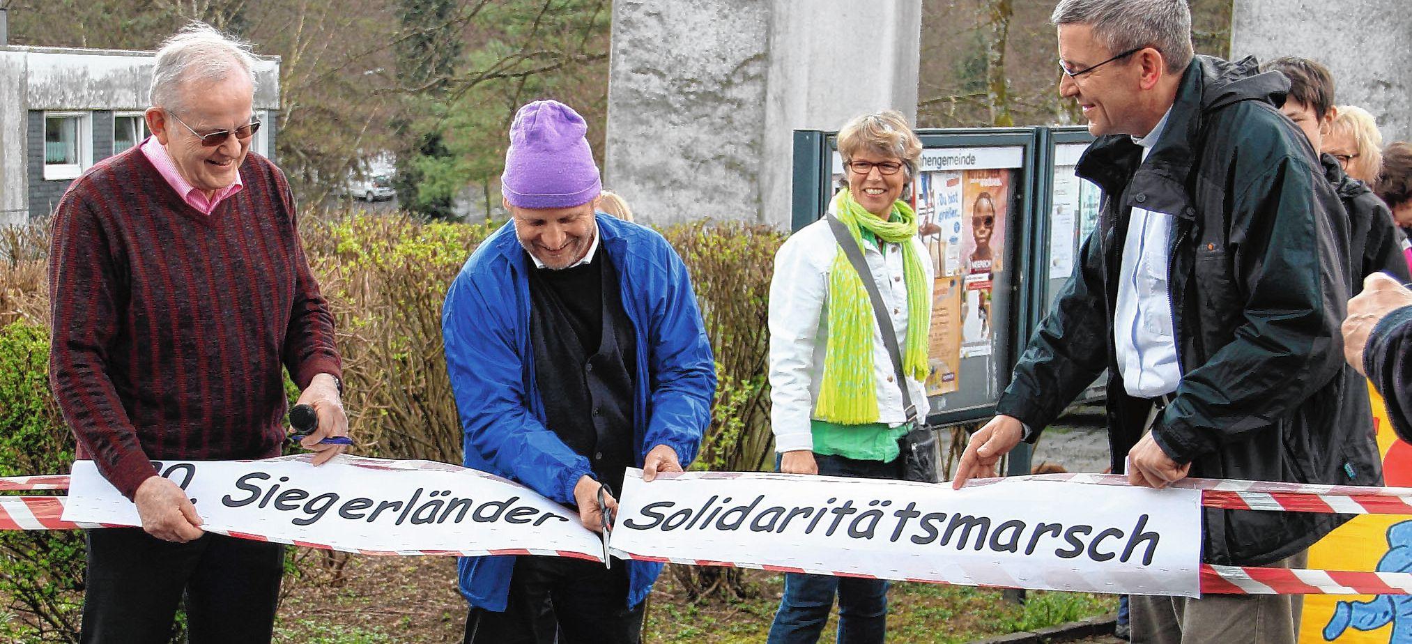 Pirmin Spiegel durchschneidet das Startband zum Siegerländer Solidaritätsmarsch. Gehalten wird es von Willi Zeumer (l.) vom organisierenden Eine-Welt-Kreis und Pfarrer Karl-Hans Köhle, Leiter des Pastoralverbundes Hüttental-Freudenberg.