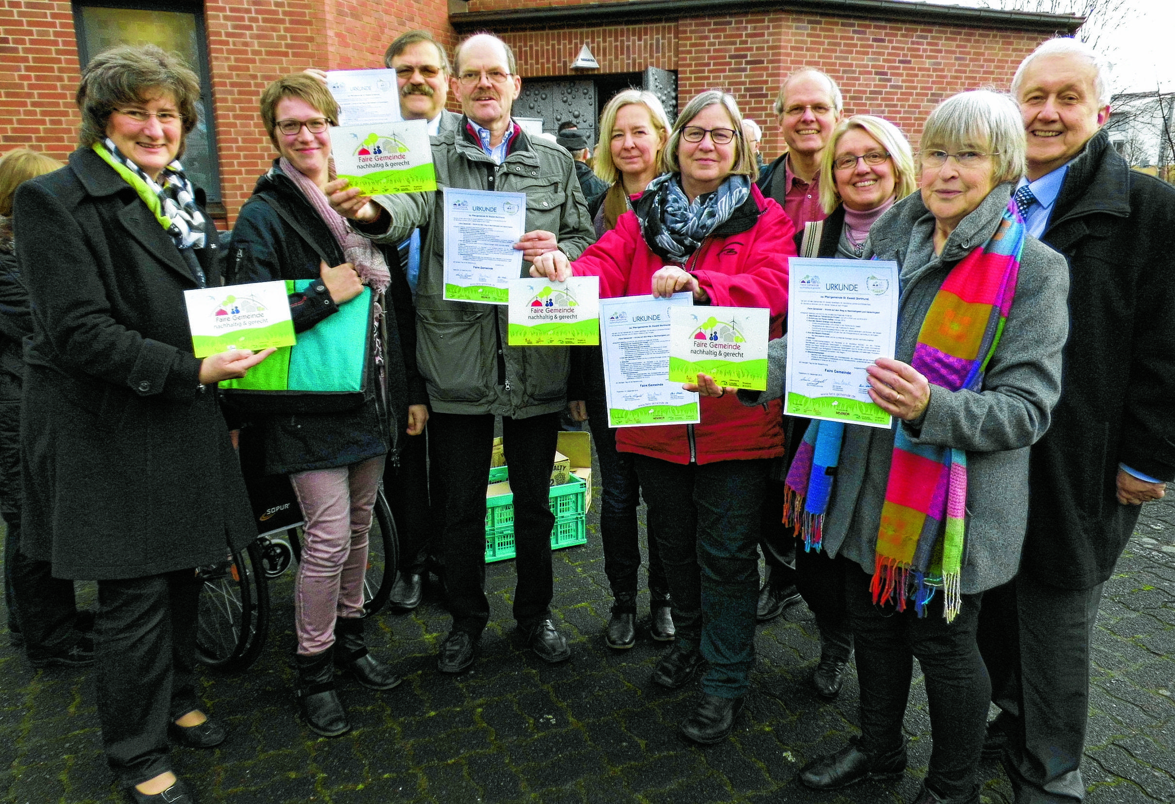 Dortmund-Aplerbeck. Mit dem Titel „Faire Gemeinde“ wurde die Gemeinde St. Ewaldi durch Vertreter des Erzbistums ausgezeichnet. Als sichtbare Zeichen erhielten Mitglieder des Pfarreiausschusses eine entsprechende Plakette und die dazugehörenden Urkunden.
