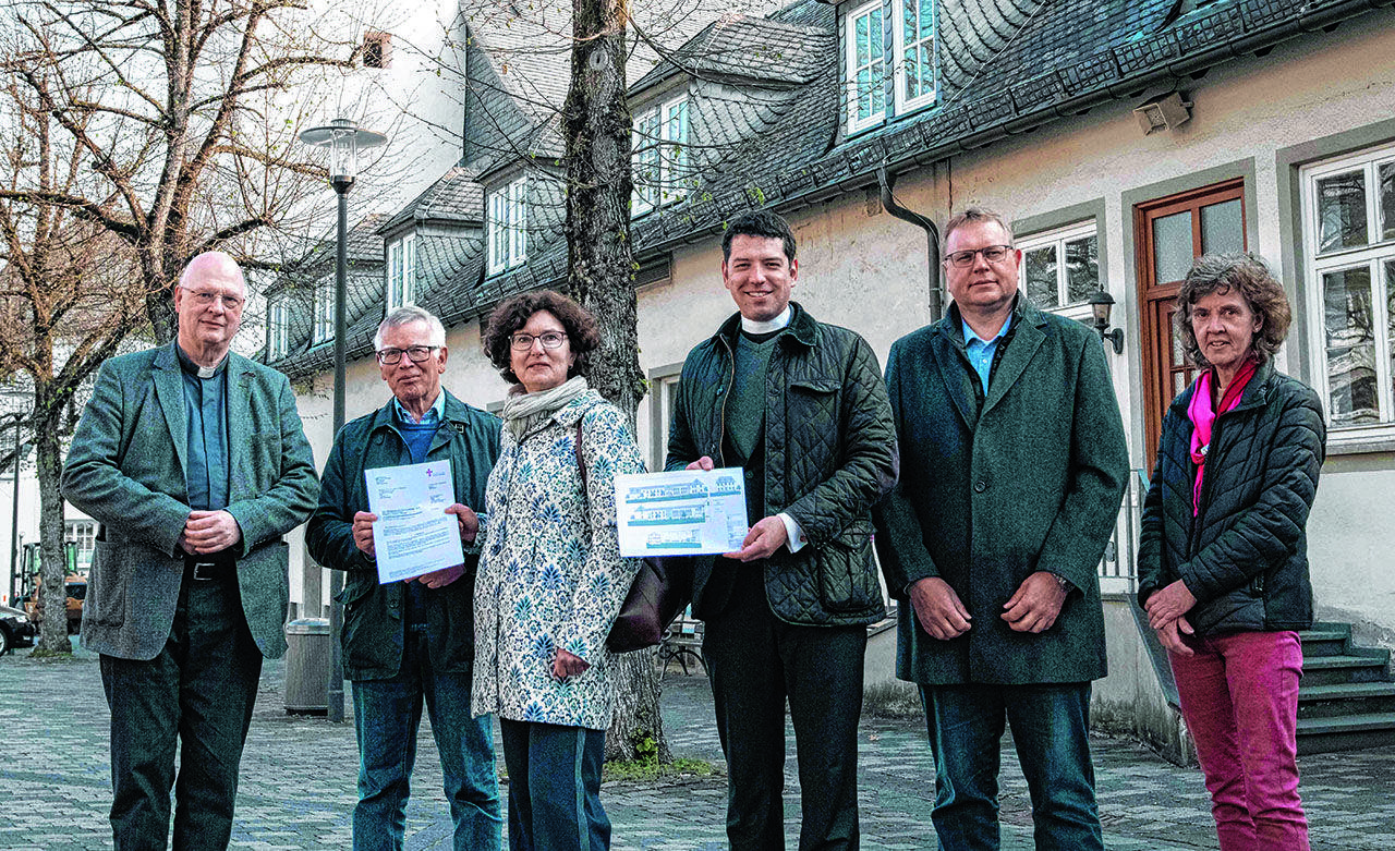 Meschede (pdp). Generalvikar Alfons Hardt hat der Kirchengemeinde St. Walburga in Meschede die Förderzusage für umfangreiche Sanierungs- und Umbaumaßnahmen am Stiftsplatz übergeben. Damit erteilte das Erzbistum Paderborn die Genehmigung für die Ausführungsplanung und Vergabe­phase des Bauprojektes Stiftsforum. In der Bauphase sollen die Nutzflächen der Gemeindegebäude an den pastoralen Bedarf angepasst und teilweise reduziert werden. „Wir freuen uns, wenn wir durch finanzielle Unterstützung eines nachhaltigen Bauvorhabens ein Gemeindeleben ermöglichen, das auch in Zukunft tragfähig bleibt und den Glauben zur Entfaltung bringt“, erklärte Generalvikar Hardt beim Treffen mit Pastor Jakob Jan Küchler, Verwaltungsleiter Axel Hesse, Mitgliedern des Kirchenvorstandes sowie Architekt Ansgar Bültmann.