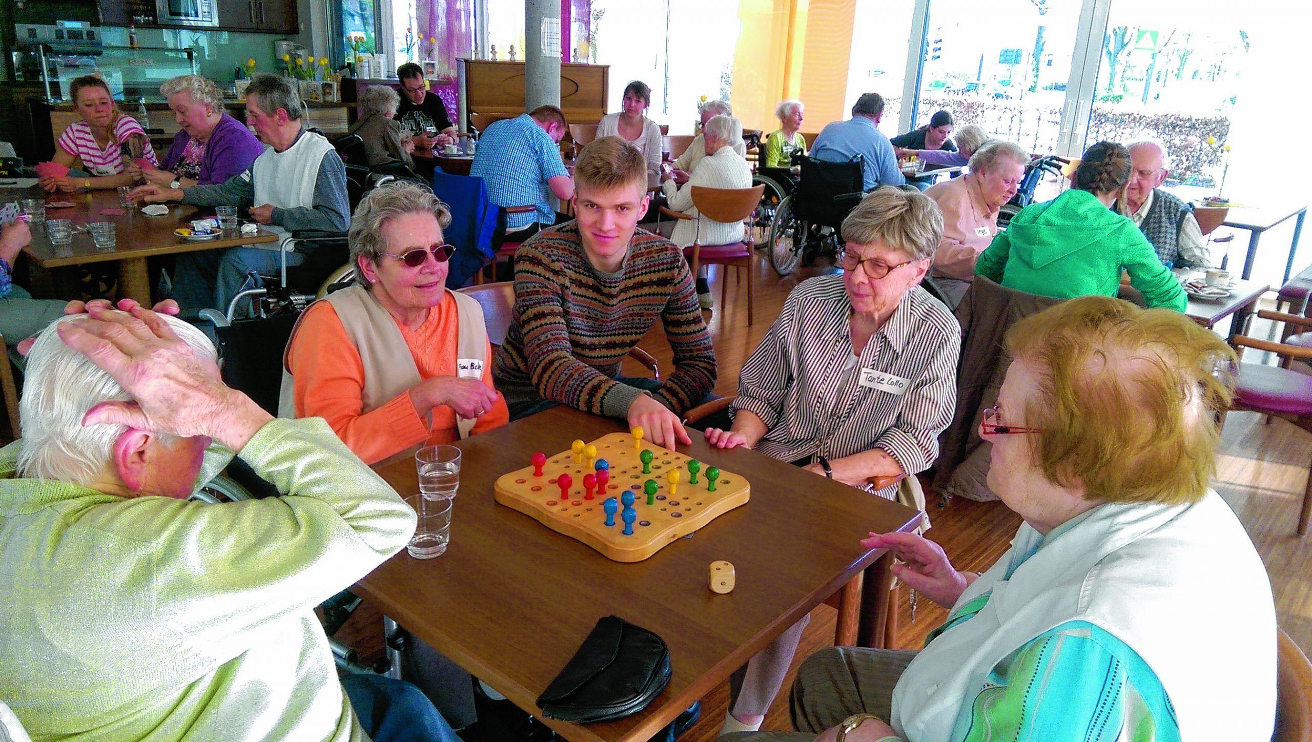 16 Bewohner des Altenzen­trums warteten gespannt auf diese Tante Inge, die mit Spielen im Gepäck die jungen Menschen zu ihnen bringen soll. Alexandra (22) ist die erste, die sich zu Frau S. (88), Frau W. (101) und Herrn B. (87) setzt und eine Runde „Mensch-ärgere-dich-nicht“ spielt. Sie war auch schon bei „Tante Inge backt“ dabei und hofft weiter auf ein Tandem, und hat mit den neuen Spielerfreunden Telefonnummern ausgetauscht.