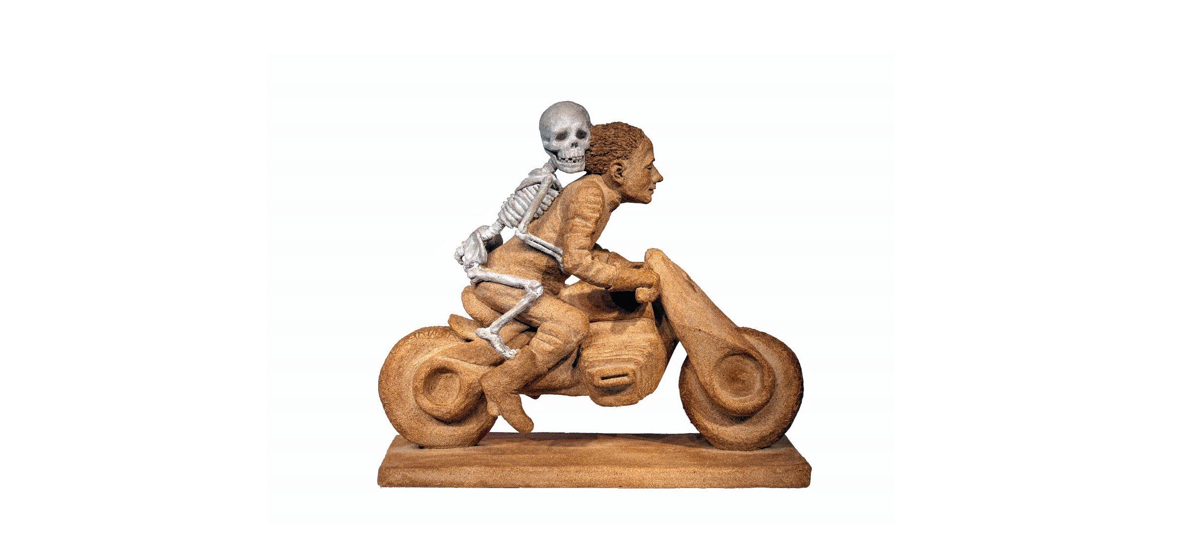 Die Reihenfolge ihrer Figuren in der Ausstellung ist ihr eigentlich egal, sagt sie. Nur für den Anfang und das Ende hat sie bestimmte Skulpturen im Sinn: Die erste ist ein freundliches Gerippe auf einem Ei, beim letzten hält das Skelett dem Betrachter einen Spiegel entgegen, stützt sich dabei auf eine ablaufende Sanduhr. Das Anliegen der Künstlerin ist klar: Es ist eine Aufforderung, „ein Anstupsen“, sich auch einmal mit dem eigenen Tod zu befassen. Das hat sie auch schon selbst getan, nicht nur in Vorbereitung auf das Schaffen ihrer Skulpturen. Denn es gibt eine 16. Skulptur, die nicht in der Ausstellung zu sehen ist, der Tod, der eine Frau mit kurzem Haar umfasst – eine Skulptur für ihr eigenes Grab. „Es ist Qualitätsgewinn, sich mit dem eigenen Ende zu beschäftigen“, sagt Angela Eberhard. „Ich lebe viel intensiver.“
