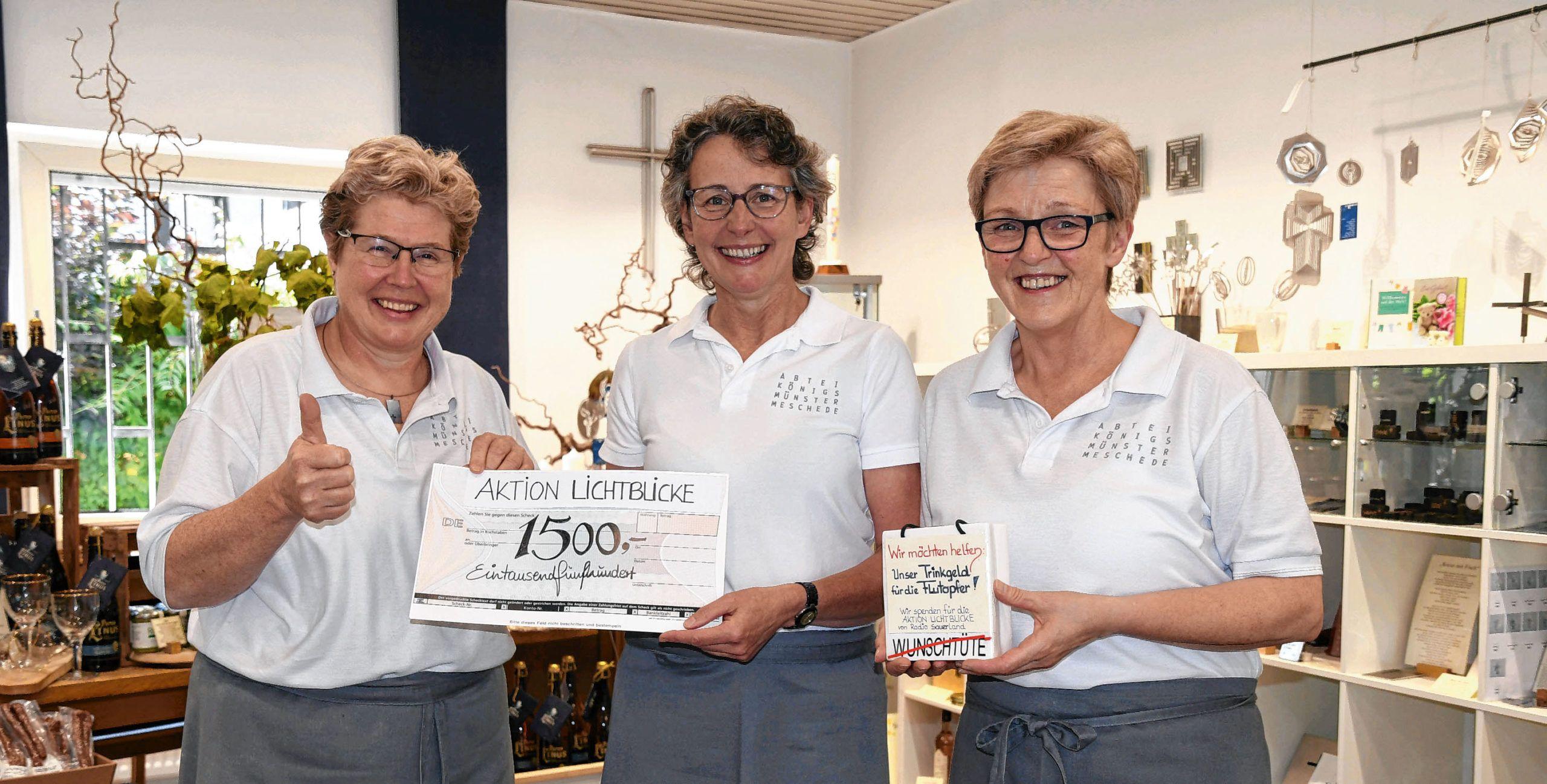 Im Juli entschlossen sich Brigitte Frings, Silvia Büscher und Bettina Schulte vom Ladenteam, eine Sammeldose aufzustellen und um Spenden zu bitten. Mit einer kleinen Unterstützung der Mitarbeitenden auf dem Klosterberg in Meschede sind 1.160 Euro zusammengekommen. Bruder Antonius von der Klosterverwaltung stockte diesen Betrag aus Mitteln des Katastrophenfonds auf. Dieser Fonds speist sich aus dem Verkauf der Wohlfahrtsmarken und unterstützt vor allem Projekte in der Region.