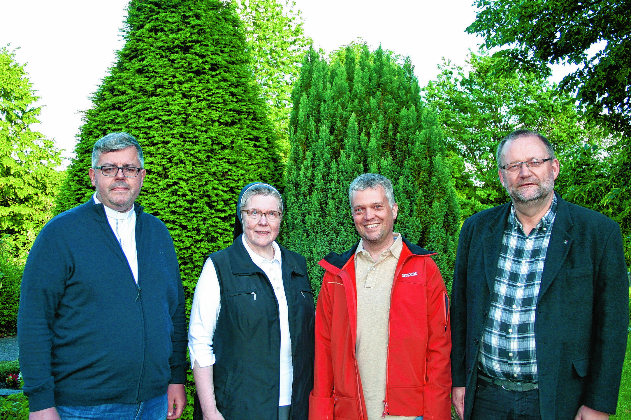 Auf dem Waldfriedhof in Attendorn (von links): Pastor Thomas Choinski, Schwester Maria Thekla Heuel, Sebastian Springob und Pfarrer Andreas Neuser.Foto: Lüttecke