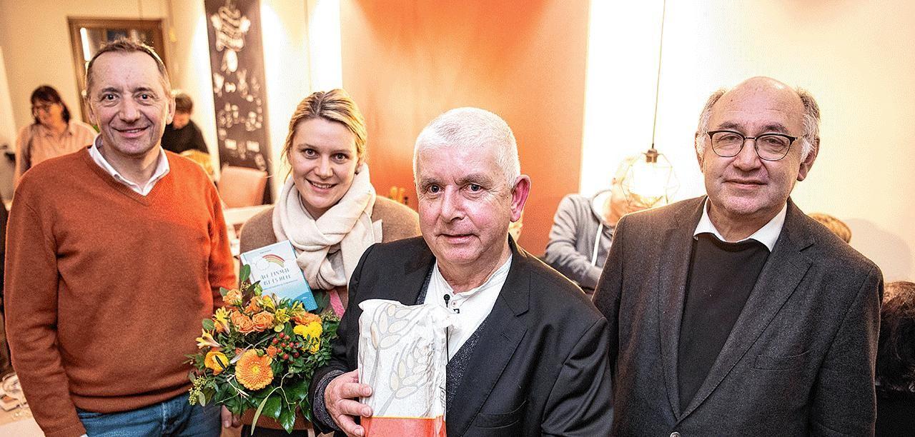 Gelungener Auftakt für die neue Veranstaltungsreihe (v. l.): Initiator Thomas Rudolphi, Corinna Mertens von der Marienloher Handwerksbäckerei Mertens, Erwin Grosche und Pfarrer Georg Kersting. (Fotos: Flüter)