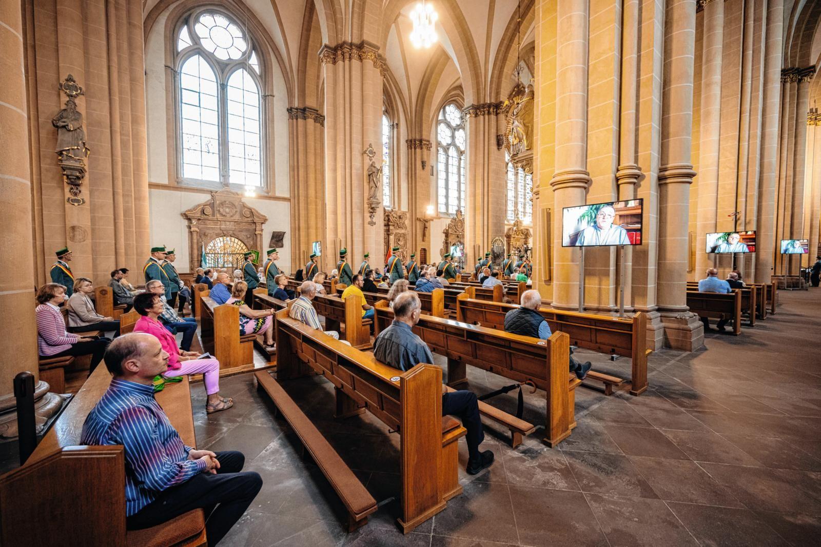 Den Gemeindepart übernimmt eine Schola, die natürlich wunderschön singt. „Das reine Hören der Psalmen hatte fast etwas Meditatives“, beschreibt es Dompropst Göbel. So ist es. Die Musik trägt einen, sie trägt einen auch ein bisschen weg, muss man zugeben: Was hat sich seit der Zeit, in der Liborius Bischof von LeMans war, im 4. Jahrhundert, alles ereignet, welche Stürme sind seither über Land und Kirche hinweggezogen? Und auch dieses Jahr der Pandemie wird in die Geschichte eingehen.