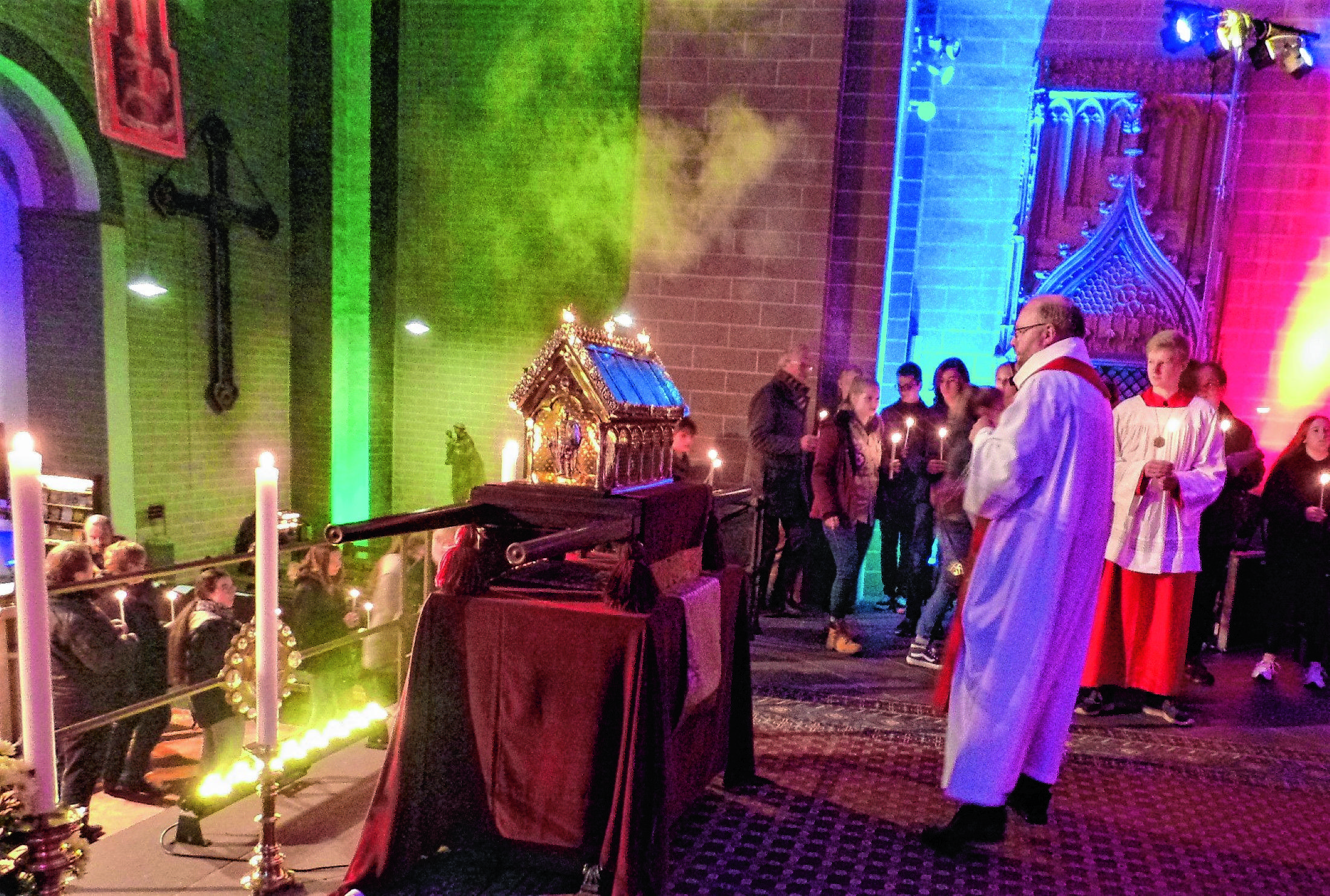 Vigil mit Schreinerhebung statt. Der Schrein mit den Reliquien wurde in einer Prozession zum Altar gebracht. Propst Dietmar Röttger zelebrierte die Messe und die zuvor verteilten Kerzen sorgten für eine stimmungsvolle Atmosphäre. Anschließend wurde noch zu Workshops, Begegnung und Lagerfeuer eingeladen.